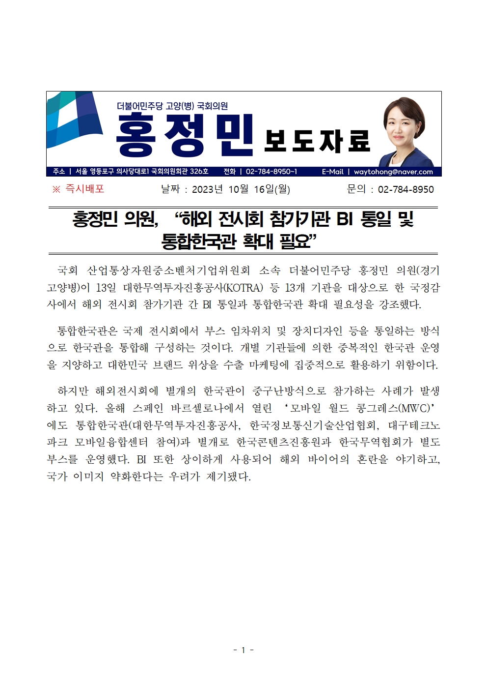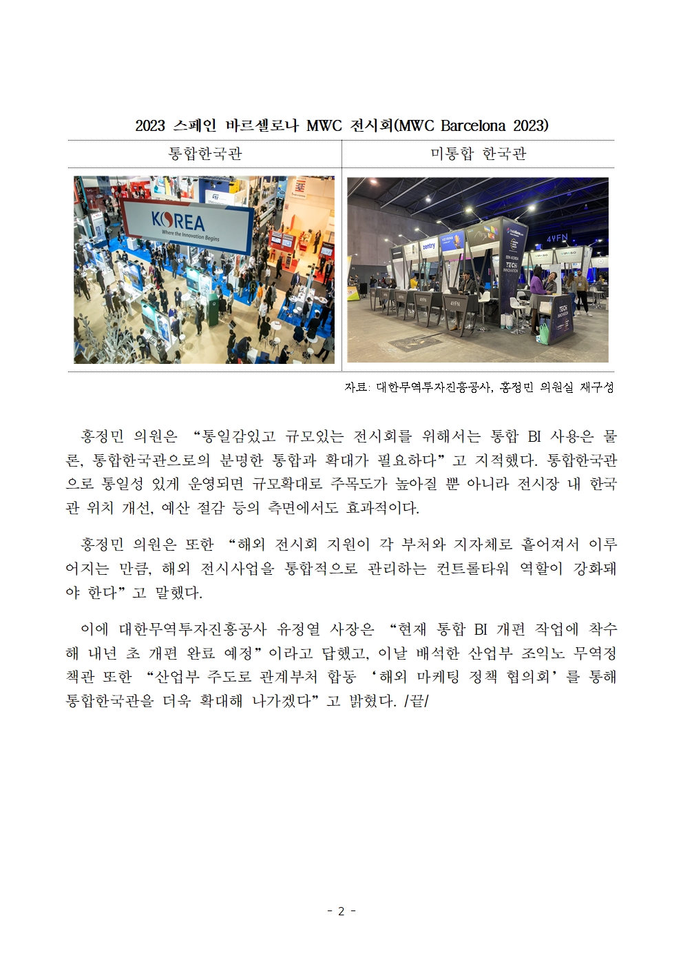 [홍정민 의원 보도자료] 해외 전시회 참가기관 BI 통일 및 통합한국관 확대 필요