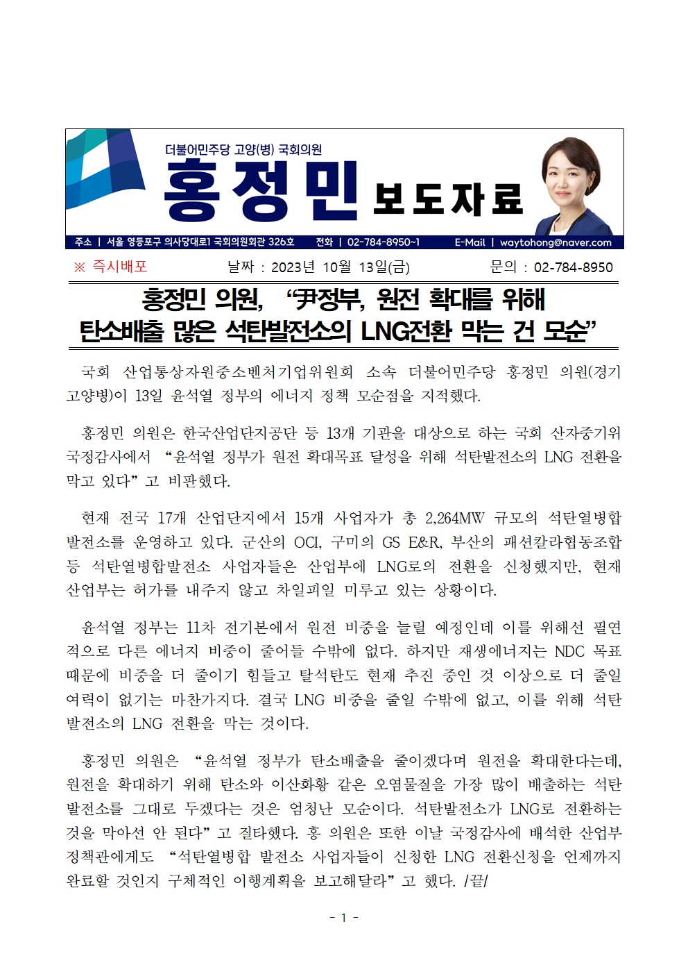 231013_보도자료_홍정민 의원 “尹정부 원전 확대를 위해 탄소배출 많은 석탄발전소의 LNG전환 막는 건 모순”.hwp