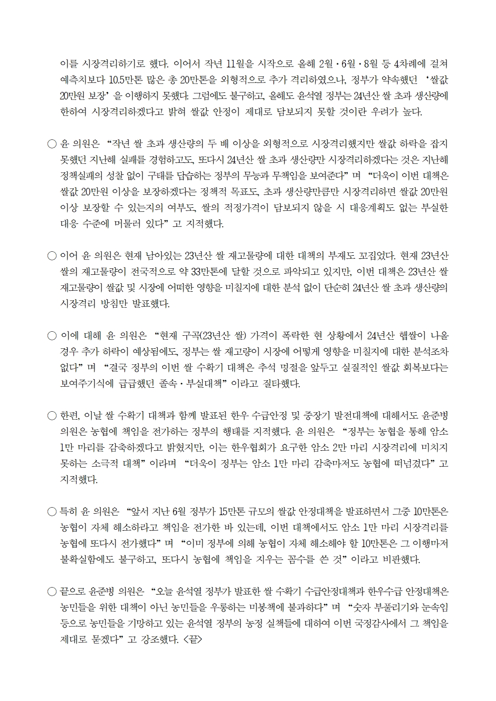 240911 [윤준병 의원 국정감사 보도자료] 윤준병 의원 “24년산 쌀 수확기 대책은 작년 실패 답습하는 졸속·부실대책!”