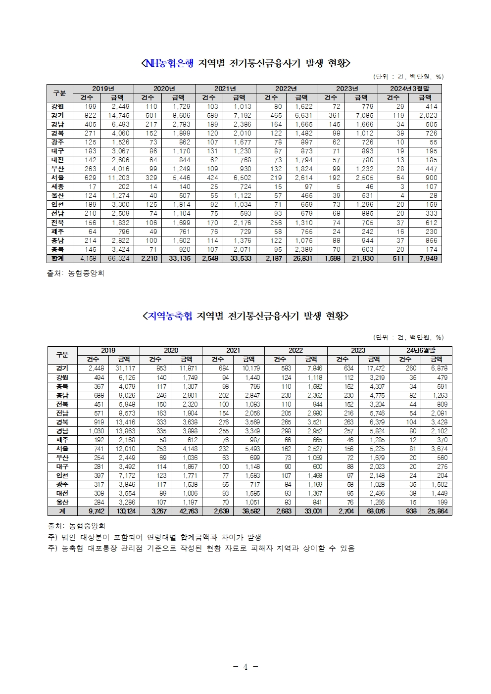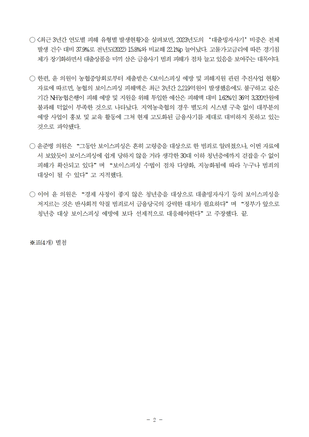 240912 [윤준병 의원 보도자료] “나이 불문” 농협 30대 이하 보이스피싱 피해 1년만에 3배 ‘껑충’.hwp