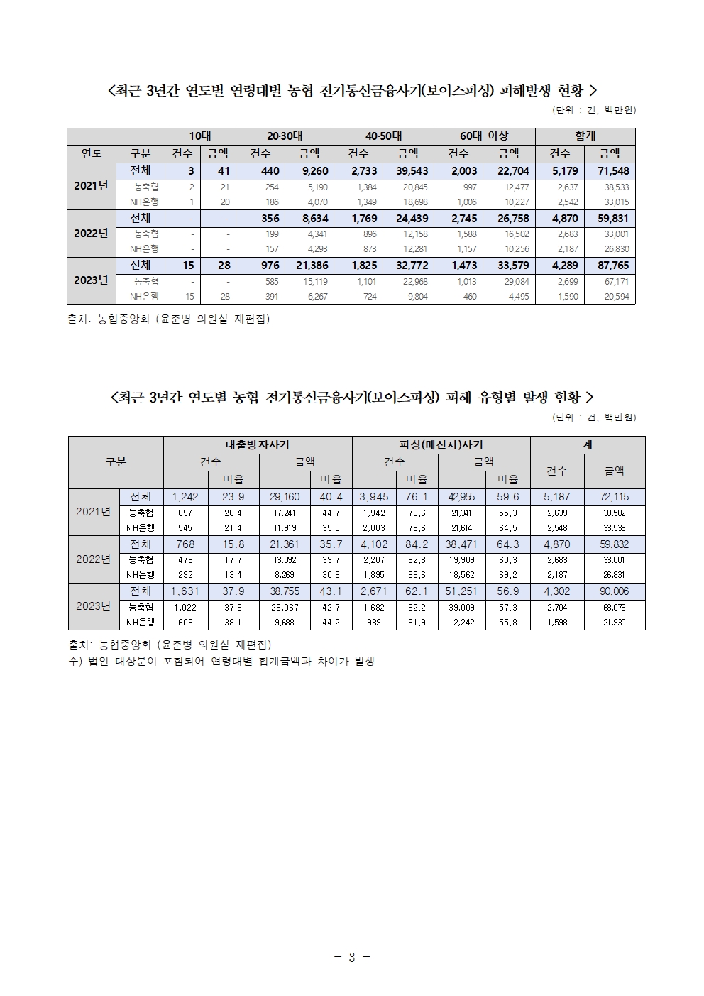 [윤준병 의원 국정감사 보도자료] “나이 불문” 농협 30대 이하 보이스피싱 피해 1년만에 3배 ‘껑충’