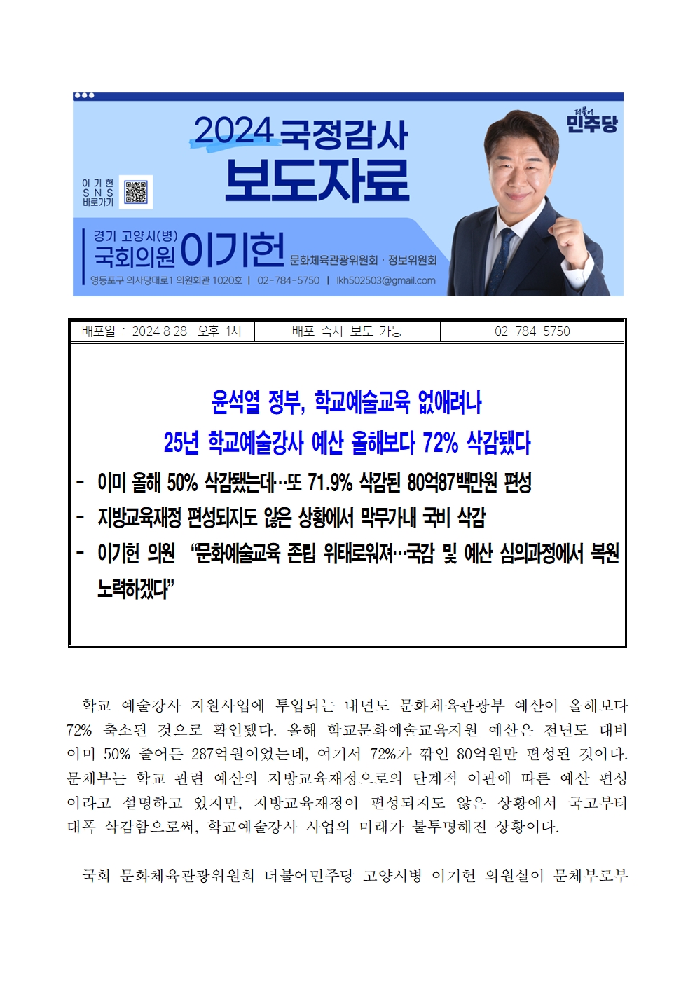 [이기헌 의원(고양시 병) 보도자료] 윤석열 정부, 학교예술교육 없애려나… 25년 학교예술강사 예산 올해보다 72% 삭감됐다
