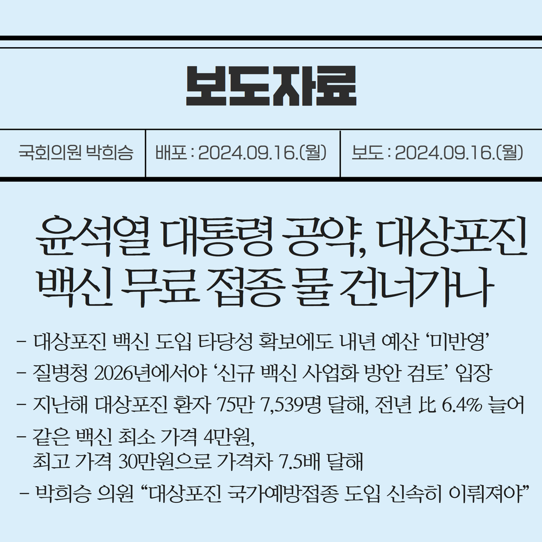 [국회의원 박희승 보도자료] 윤석열 대통령 공약, 대상포진 백신 무료 접종 물 건너가나