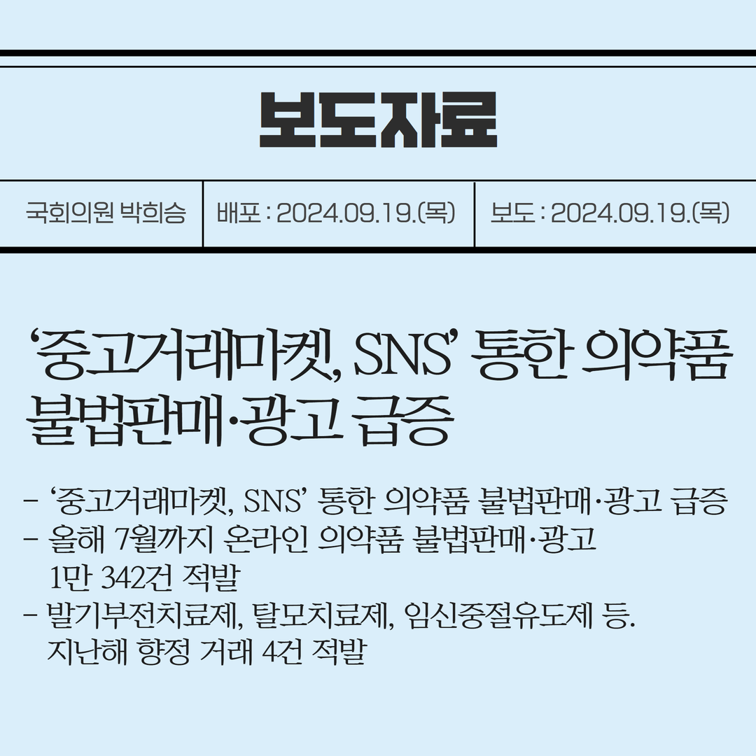[국회의원 박희승 보도자료] ‘중고거래마켓, SNS’ 통한 의약품 불법판매·광고 급증