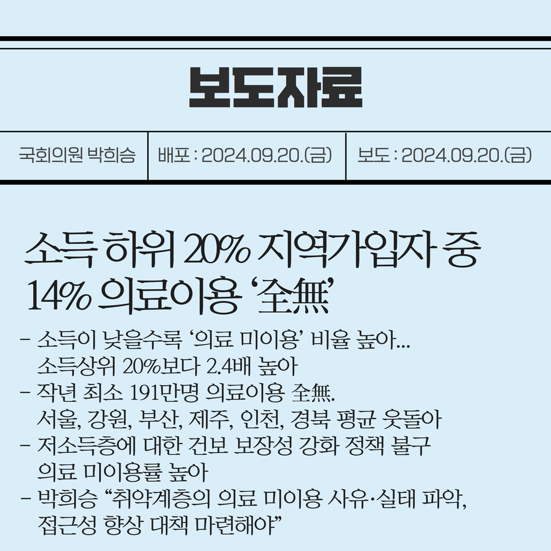 [국회의원 박희승 보도자료] 소득 하위 20% 지역가입자 중 14% 의료이용 ‘全無’