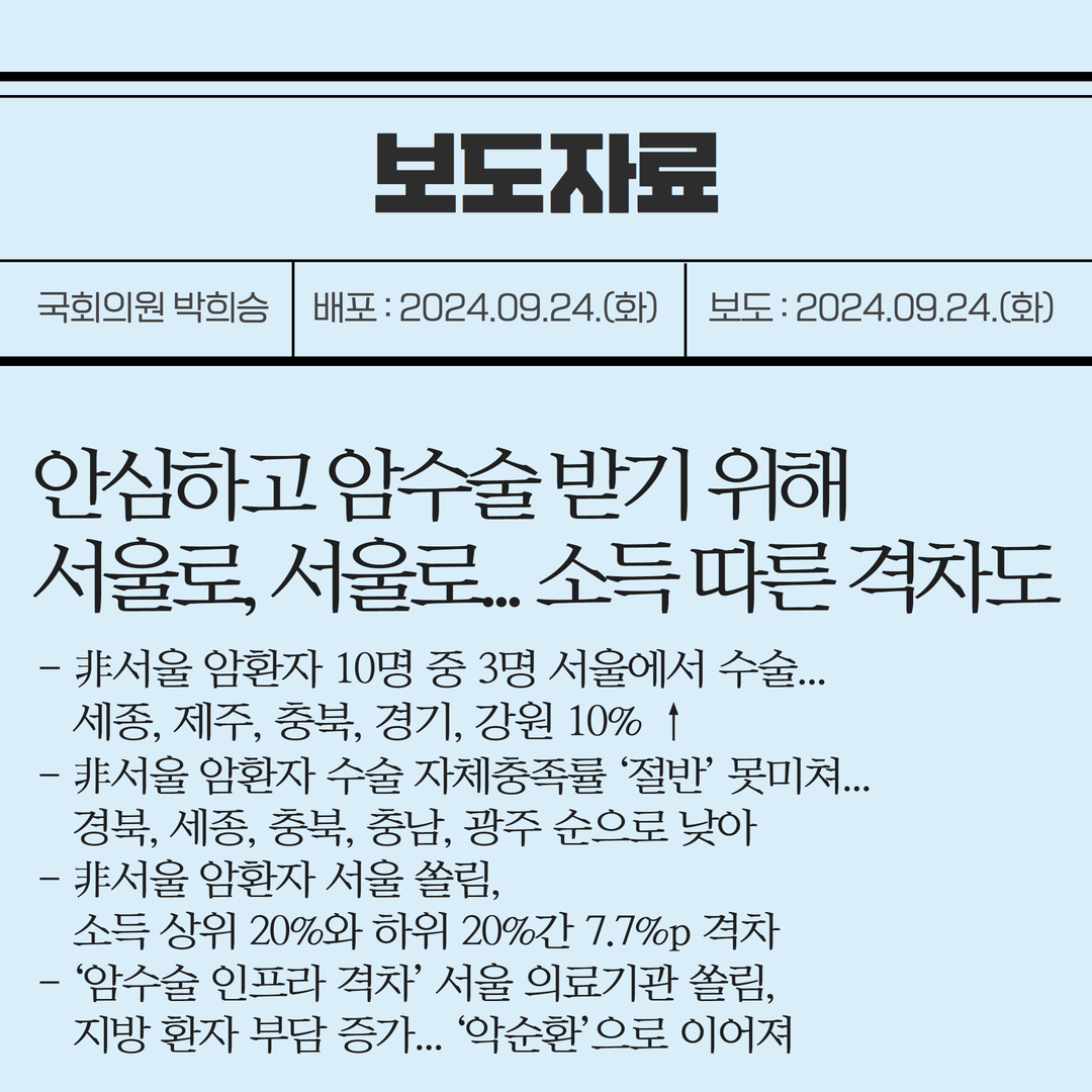 [국회의원 박희승 보도자료] 안심하고 암수술 받기 위해 서울로, 서울로... 소득 따른 격차도