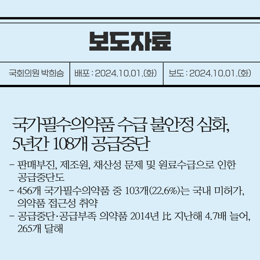[국회의원 박희승 보도자료] 국가필수의약품 수급 불안정 심화, 5년간 108개 공급중단