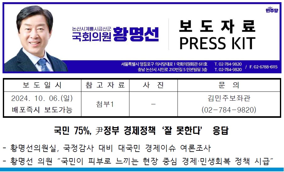 [국회의원 황명선] 국민 75%, 尹정부 경제정책‘잘 못한다’ 응답