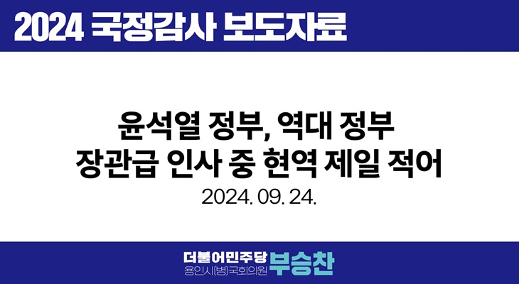 국회 국방위원회 소속 더불어민주당 부승찬 국회의원(용인시병)이 병무청으로부터 제출받은 ‘국민의 정부 이후 장관급 인사의 병역 이행 현황 자료’에 따르면, 현역으로 제대한 장관급 인사는 윤석열 정부가 50.0%로 역대 정부 중 가장 낮고 이전 정부인 문재인 정부(64.7%)보다는 14.7%p나 낮은 것으로 나타났다.