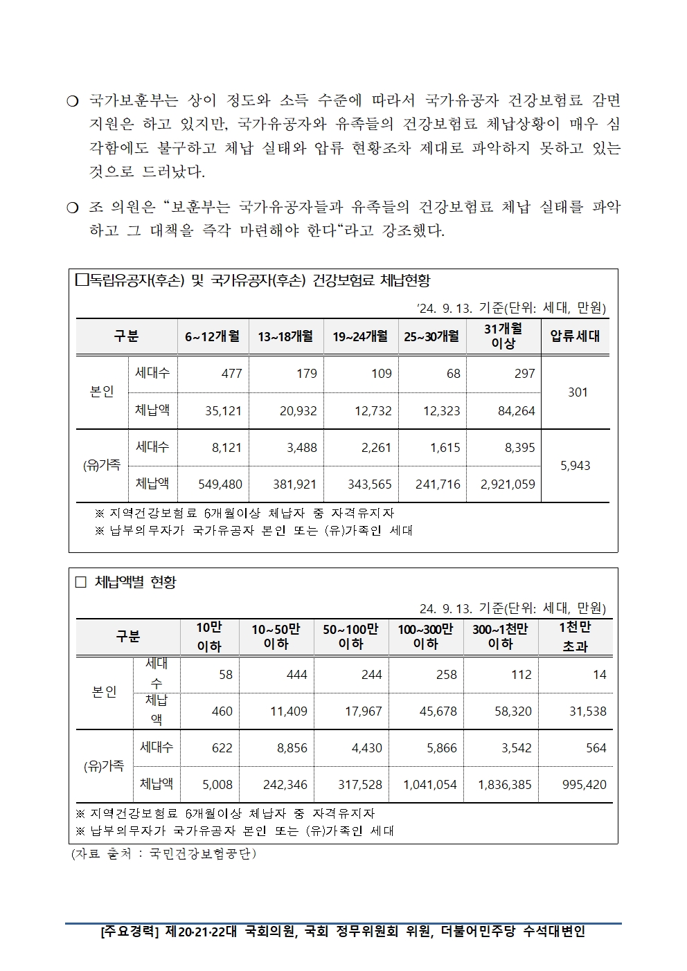 [국회의원 조승래] 국가유공자와 유족 2만 5천여 세대 6개월 이상 건강보험료 체납.. 24년 9월 현재, 체납액 약 460억 원, 예금 등 압류 6,244세대
