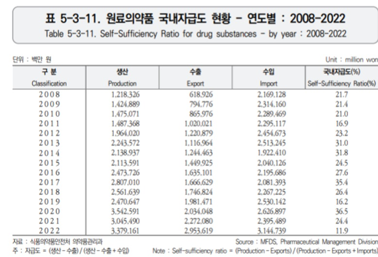 원료의약품은 완제의약품을 만드는 재료로써 중증질환은 물론 감기약도 원료의약품이 있어야 생산할 수 있다. 그러나 ‘2023 식품의약품통계연보에 따르면, 원료의약품의 국내자급도는 202036.5%에서 202211.9%로 급락했다[2].