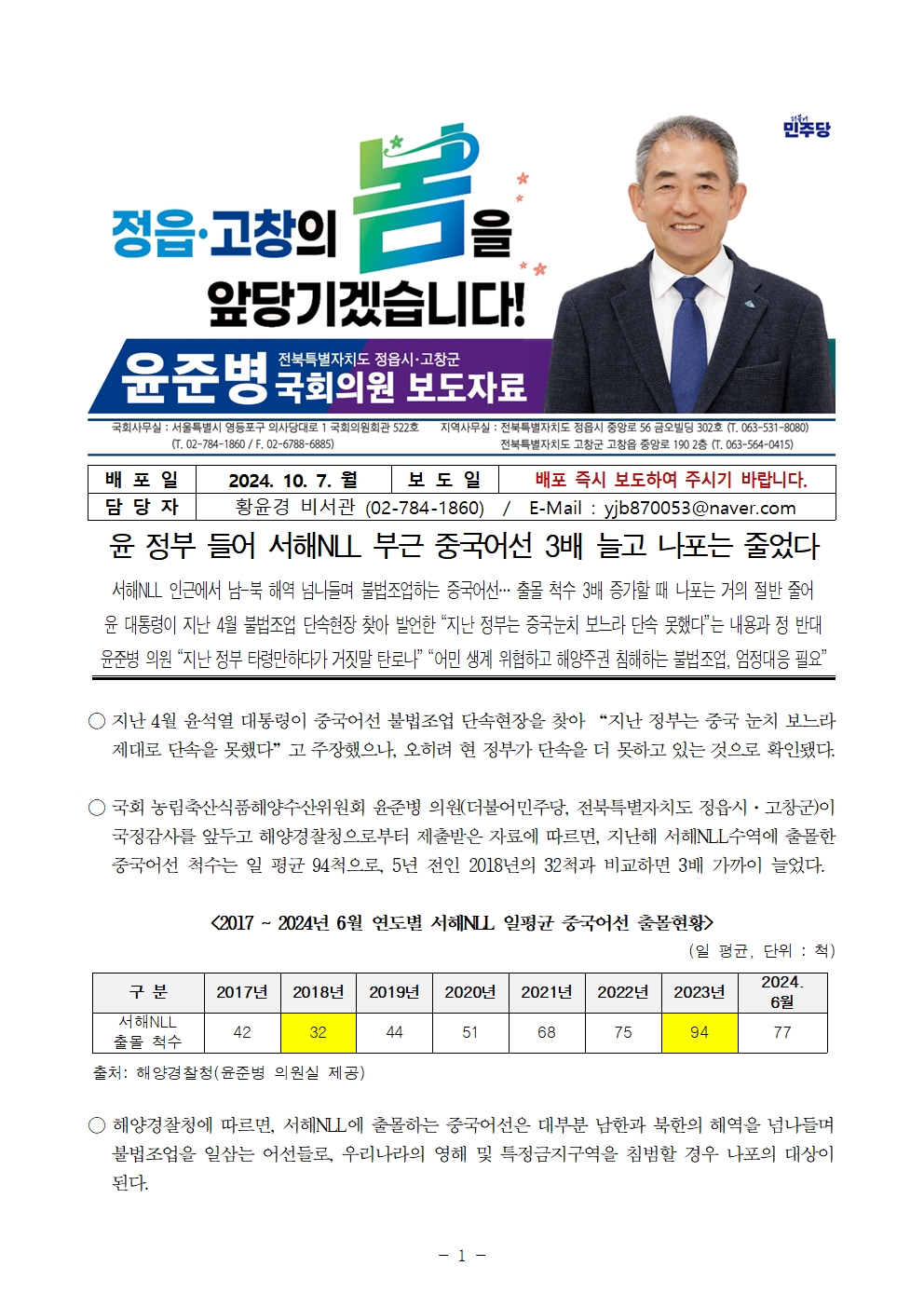 241007 [윤준병 의원 국정감사 보도자료] 윤 정부 들어 서해NLL 부근 중국어선 출몰 3배 늘었지만 나포는 줄었다.hwp
