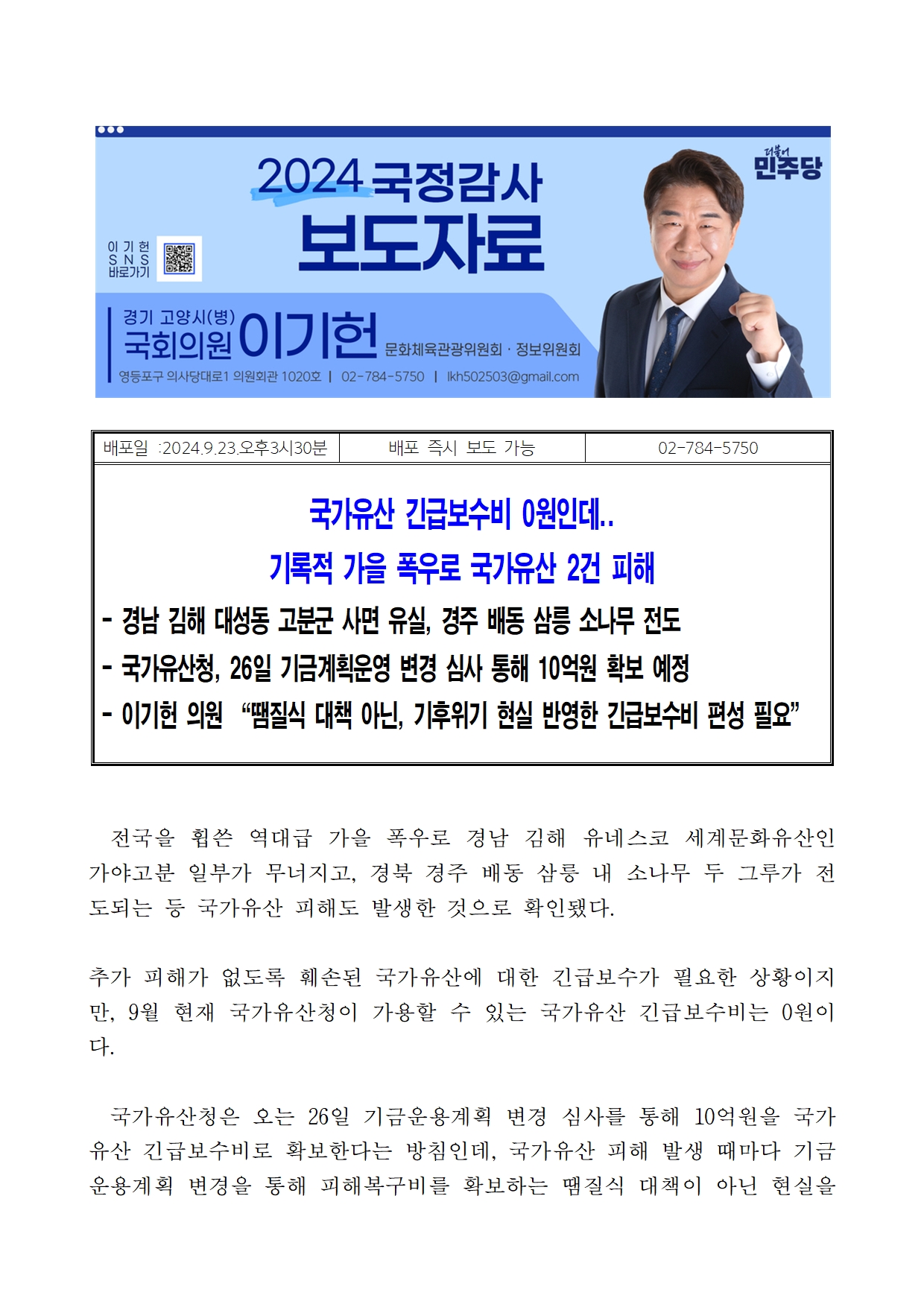 [이기헌 의원(고양시 병) 보도자료] 국가유산 긴급보수비 0원인데..기록적 가을 폭우로 국가유산 2건 피해