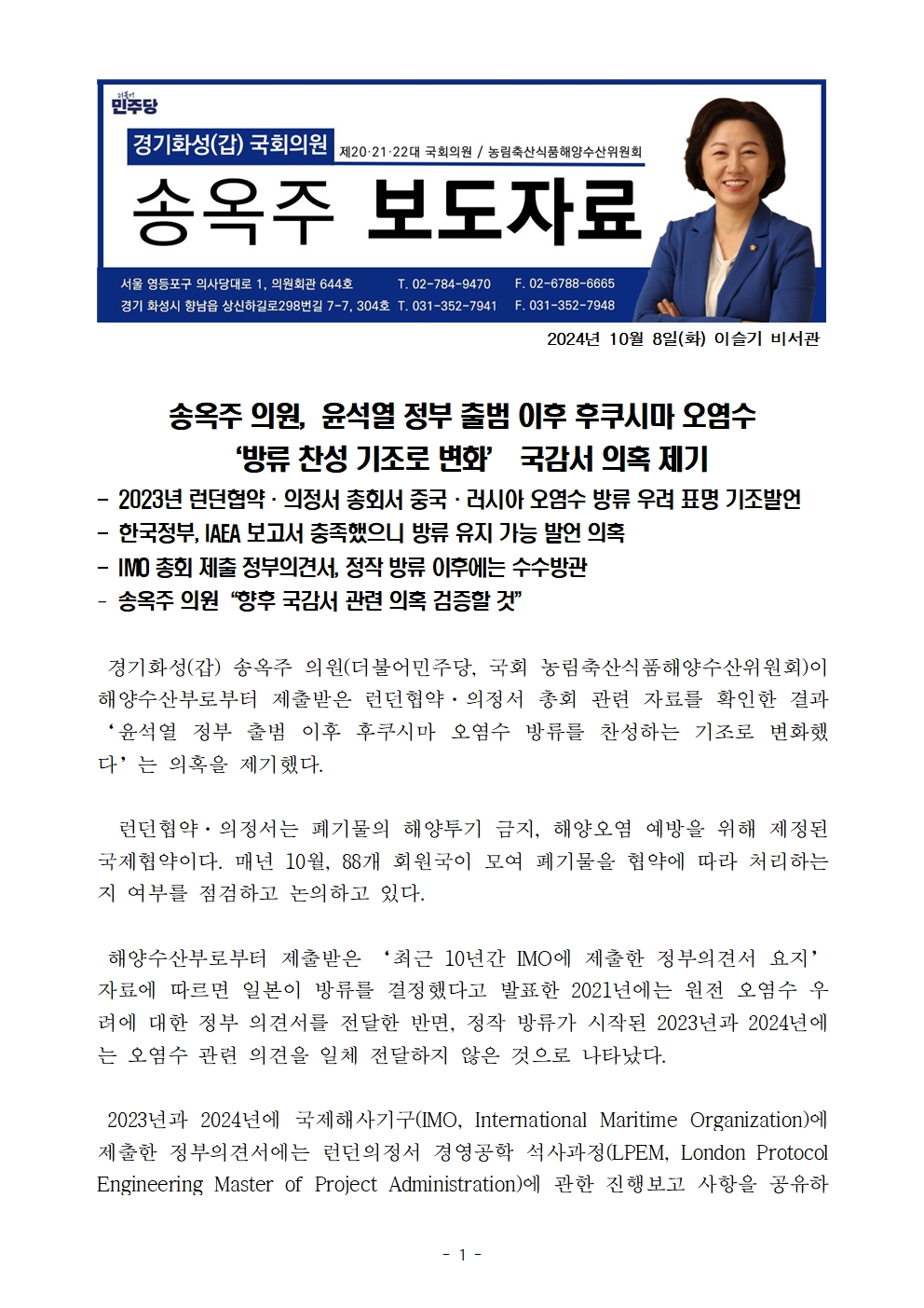 보도자료_송옥주 의원 윤석열 정부 출범 이후 후쿠시마 오염수‘방류 찬성 기조로 변화’ 국감서 의혹 제기.hwp