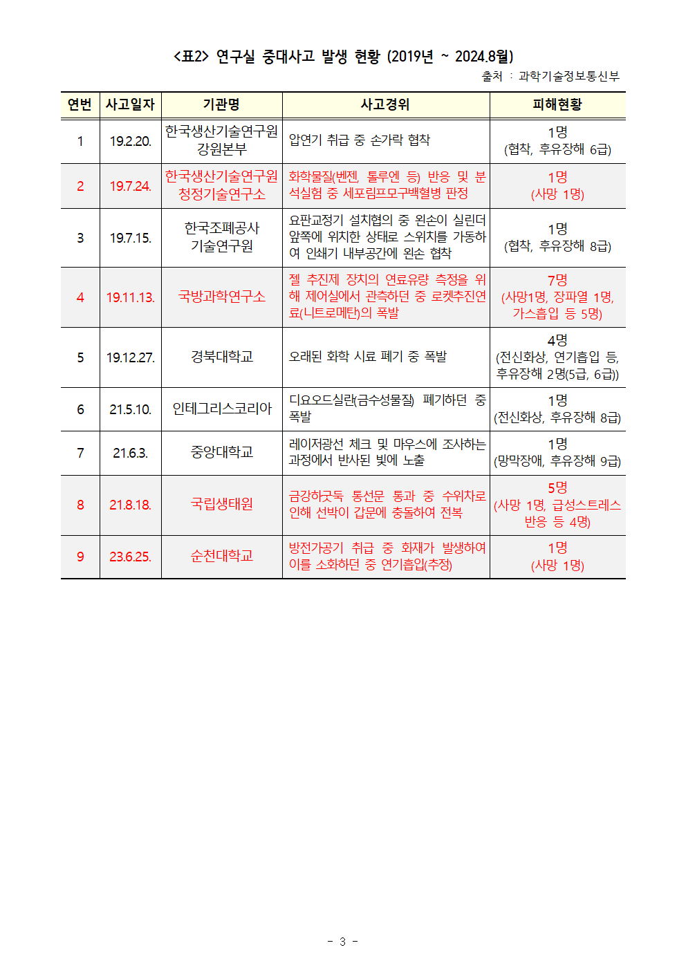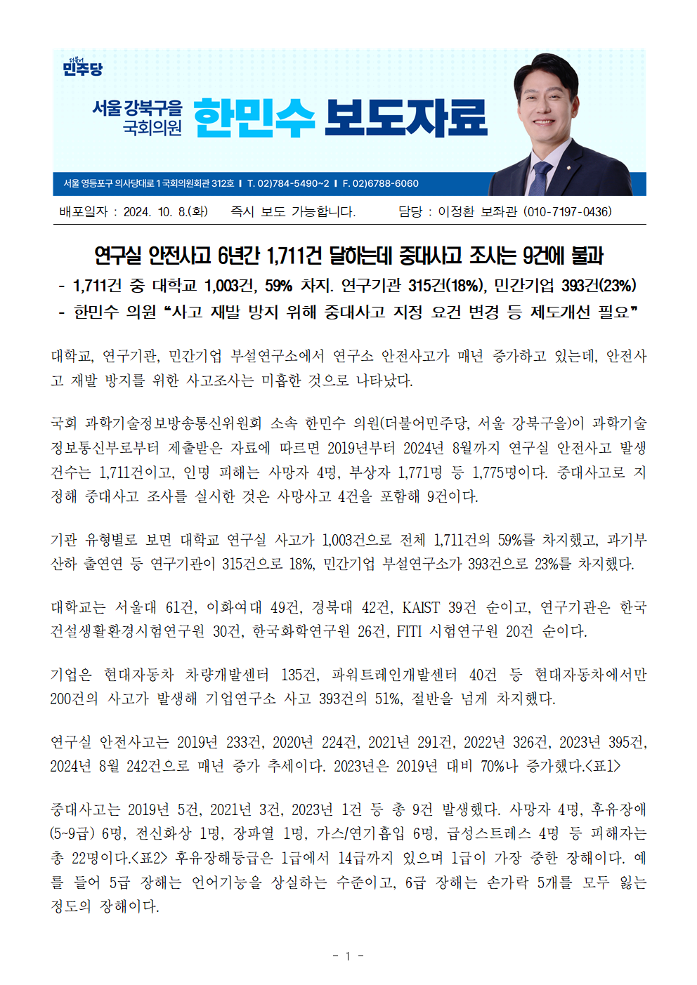 2024국감_한민수_연구실_사고_6년간_1711건_달하는데_중대사고_조사는_9건에_불과.hwp