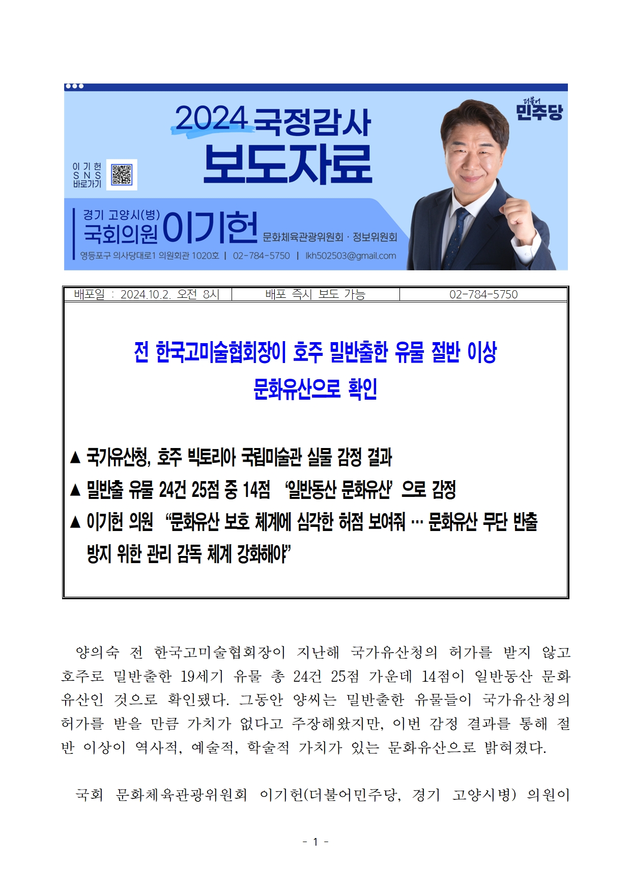 [이기헌 의원(고양시 병) 보도자료]고미술협회장이 호주로 밀반출한 유물 절반 이상이 문화유산