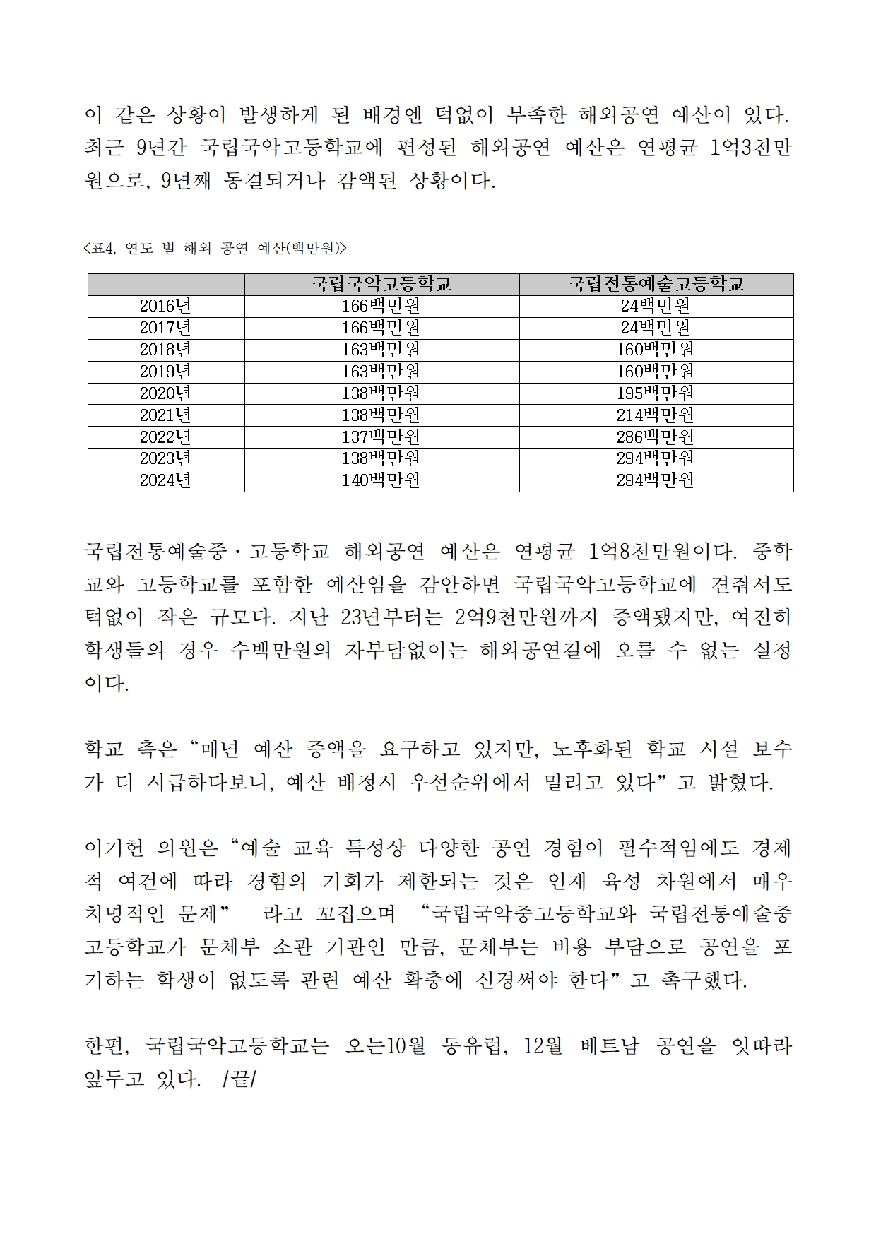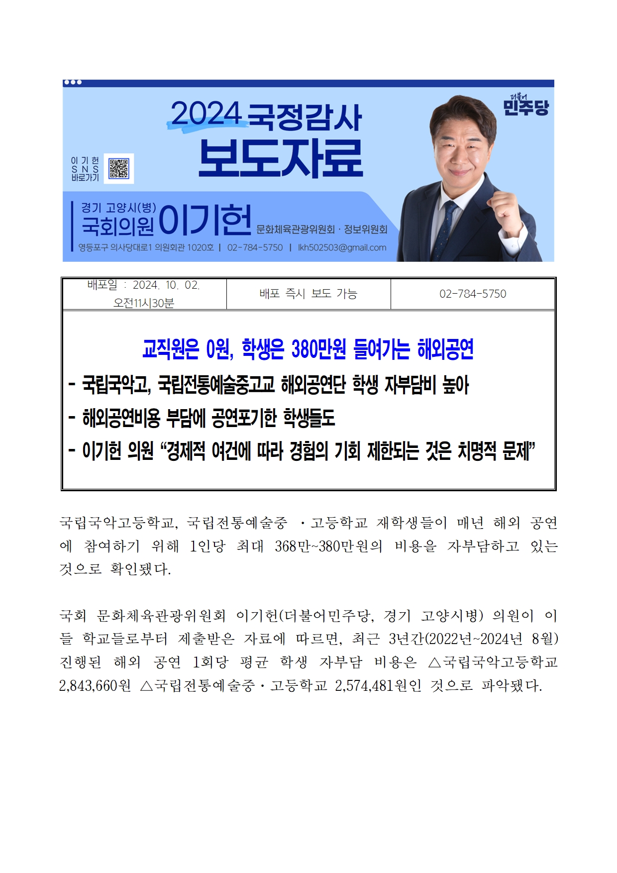 [이기헌 의원(고양시 병) 보도자료]교직원은 0원, 학생은 380만원 들여가는 해외공연