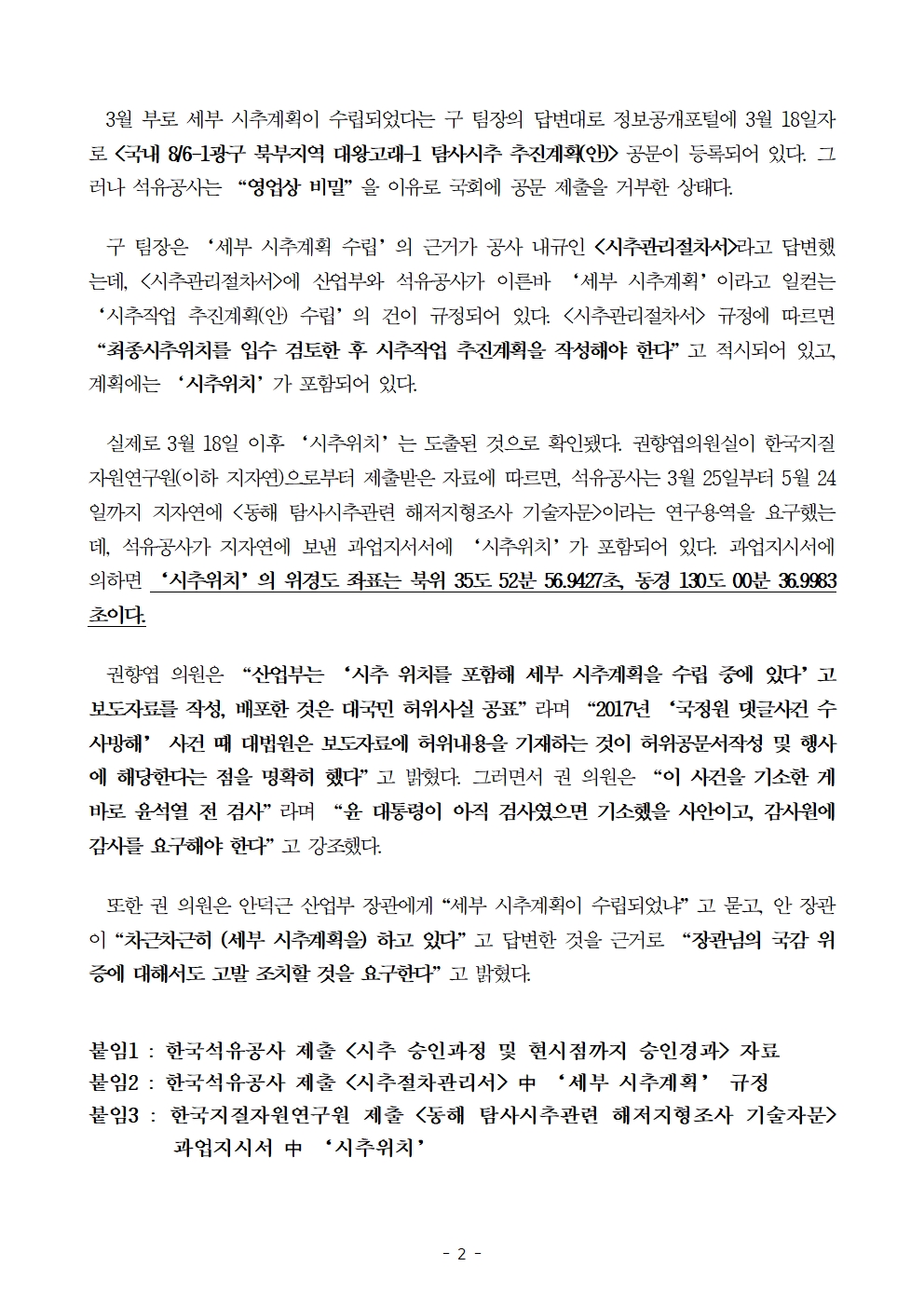[국회의원 권향엽] 석유公, 올 3월 대왕고래 '세부 시추계획' 이미 수립. 산업부, 허위 보도자료 배포