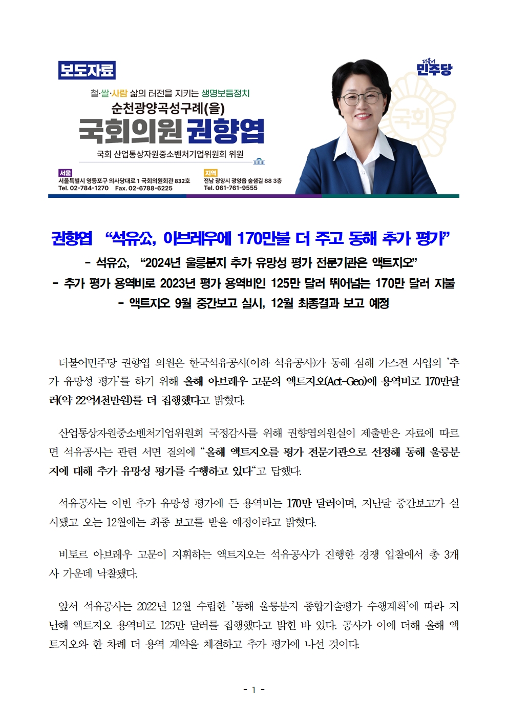 [국회의원 권향엽] 석유公, 아브레우에 170만불 더 주고 동해 추가 평가