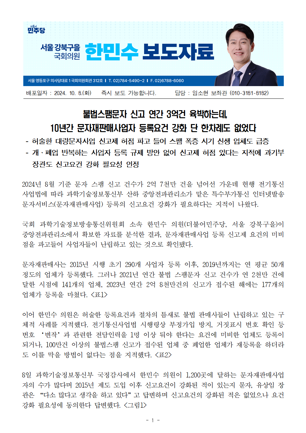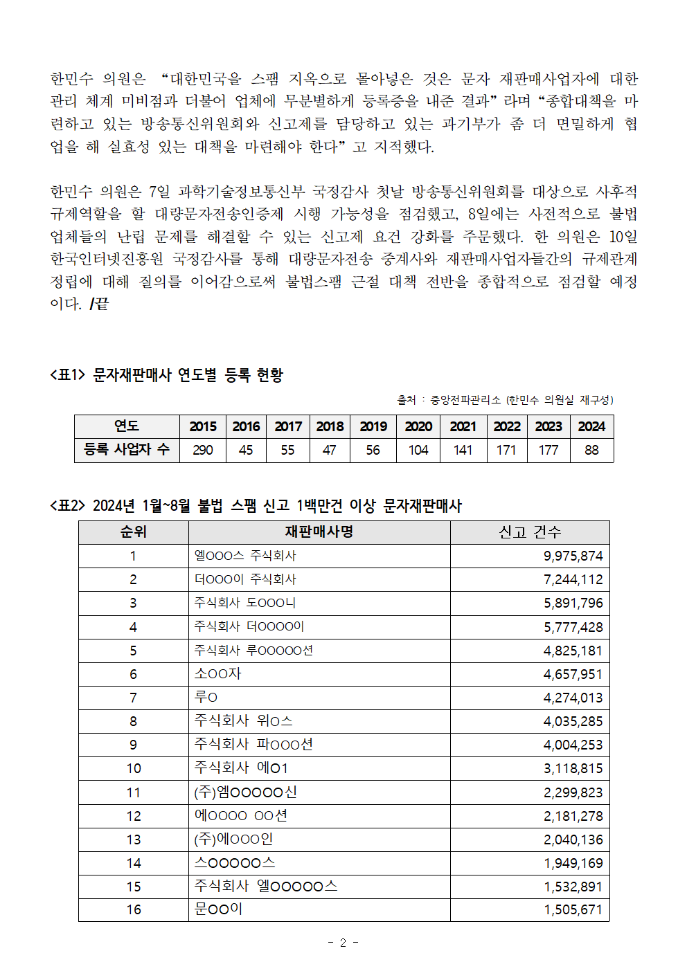 2024국감_한민수_불법스팸문자_신고_연간_3억건_육박하는데_10년간_문자재판매사업자_등록요건_강화_단_한차례도_없었다.hwp