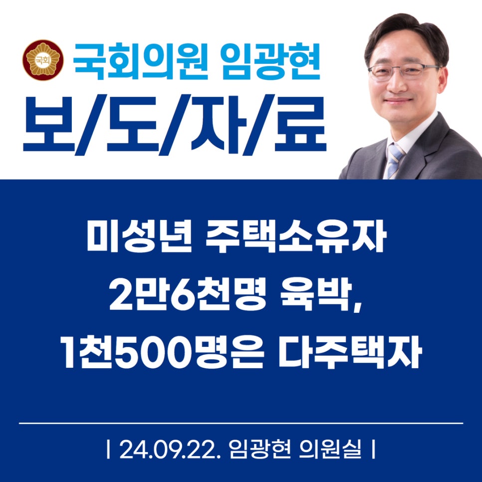 국회 기획재정위원회 임광현 의원(더불어민주당)이 통계청에서 제출받은 ‘주택소유통계’ 자료에 따르면 2022년 기준 주택을 소유한 만 19세 미만 미성년자는 2만5,933명으로 집계됐다. 이 중 2주택 이상을 소유한 미성년자는 1,516명이다.