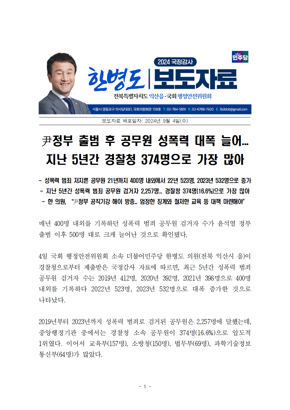 [한병도의원]2024행안위국정감사보도자료(3)_尹정부 출범 후 공무원 성폭력 대폭 늘어... 지난 5년간 경찰청 374명으로 가장 많아.hwp