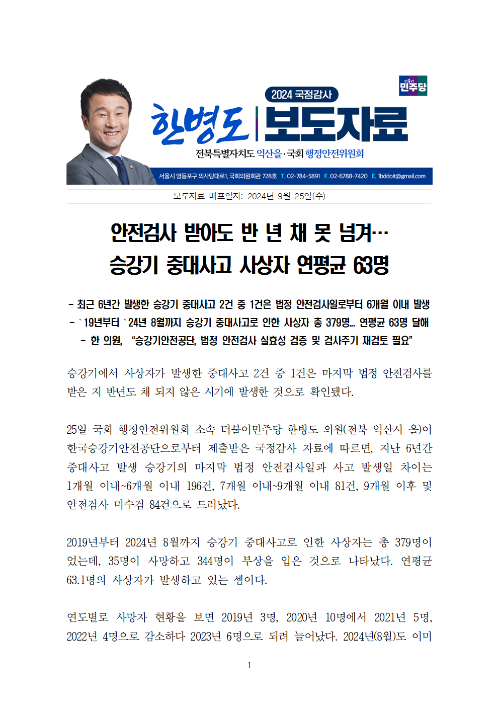[한병도의원]2024행안위국정감사보도자료(20)안전검사 받아도 반 년 채 못 넘겨…승강기 중대사고 사상자 연평균 63명.hwp