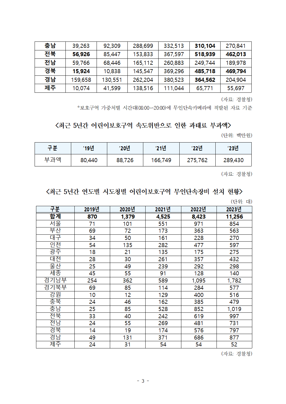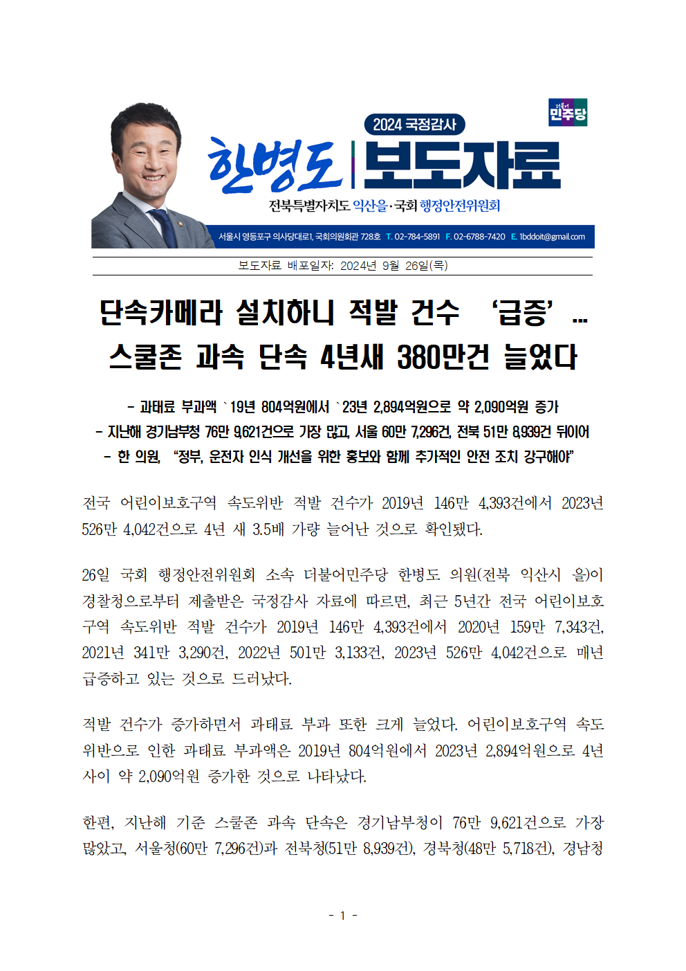 [한병도의원]2024행안위국정감사보도자료(21)단속카메라 설치하니 적발 건수 ‘급증’... 스쿨존 과속 단속 4년새 380만건 늘었다.hwp
