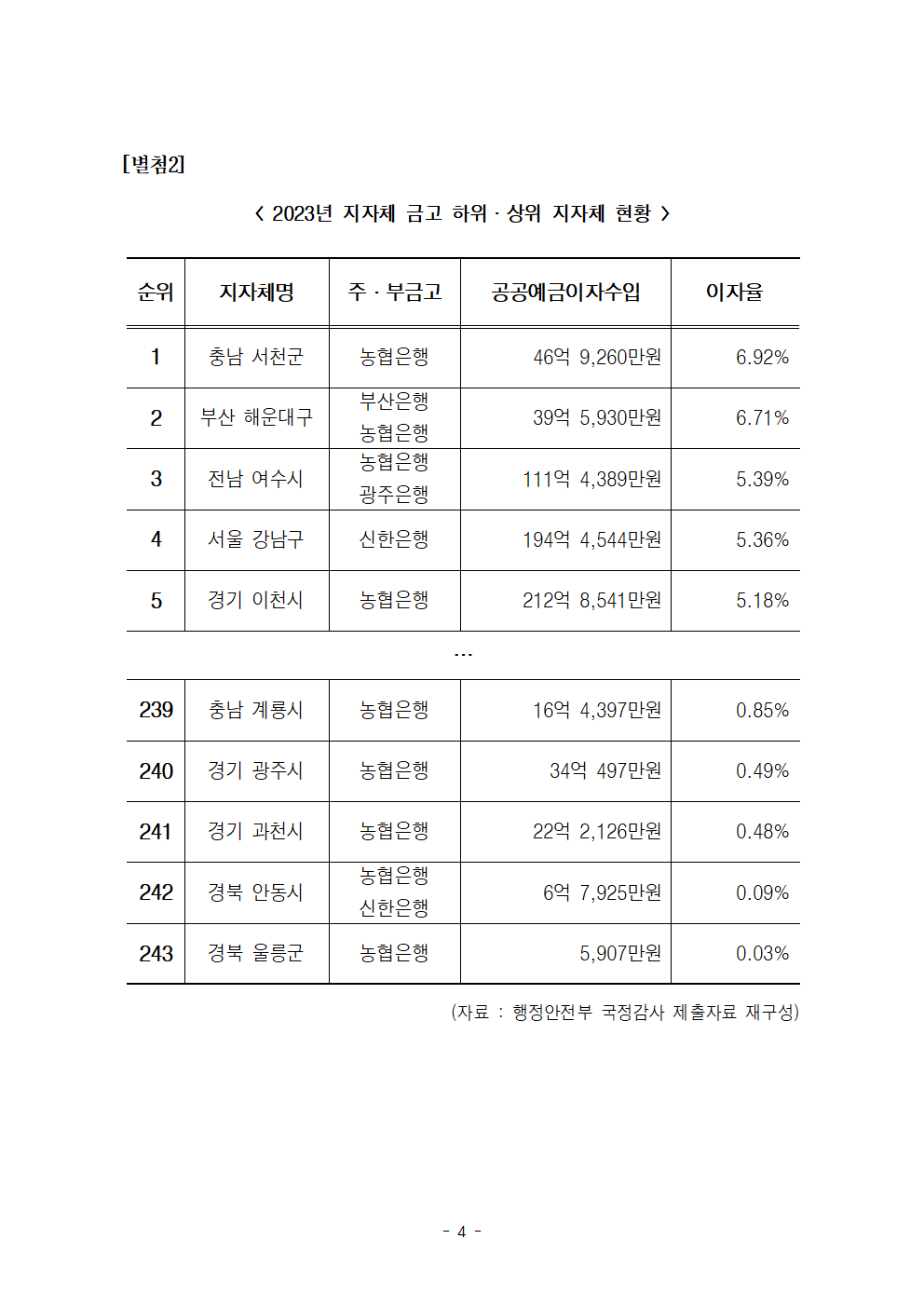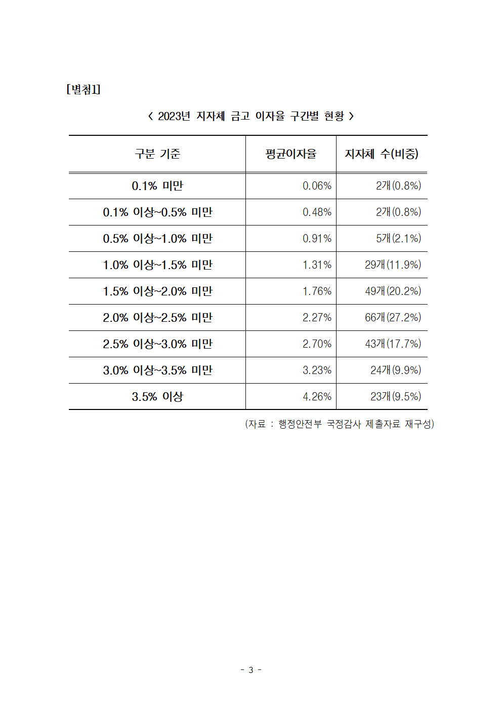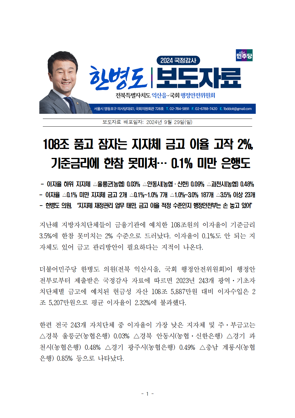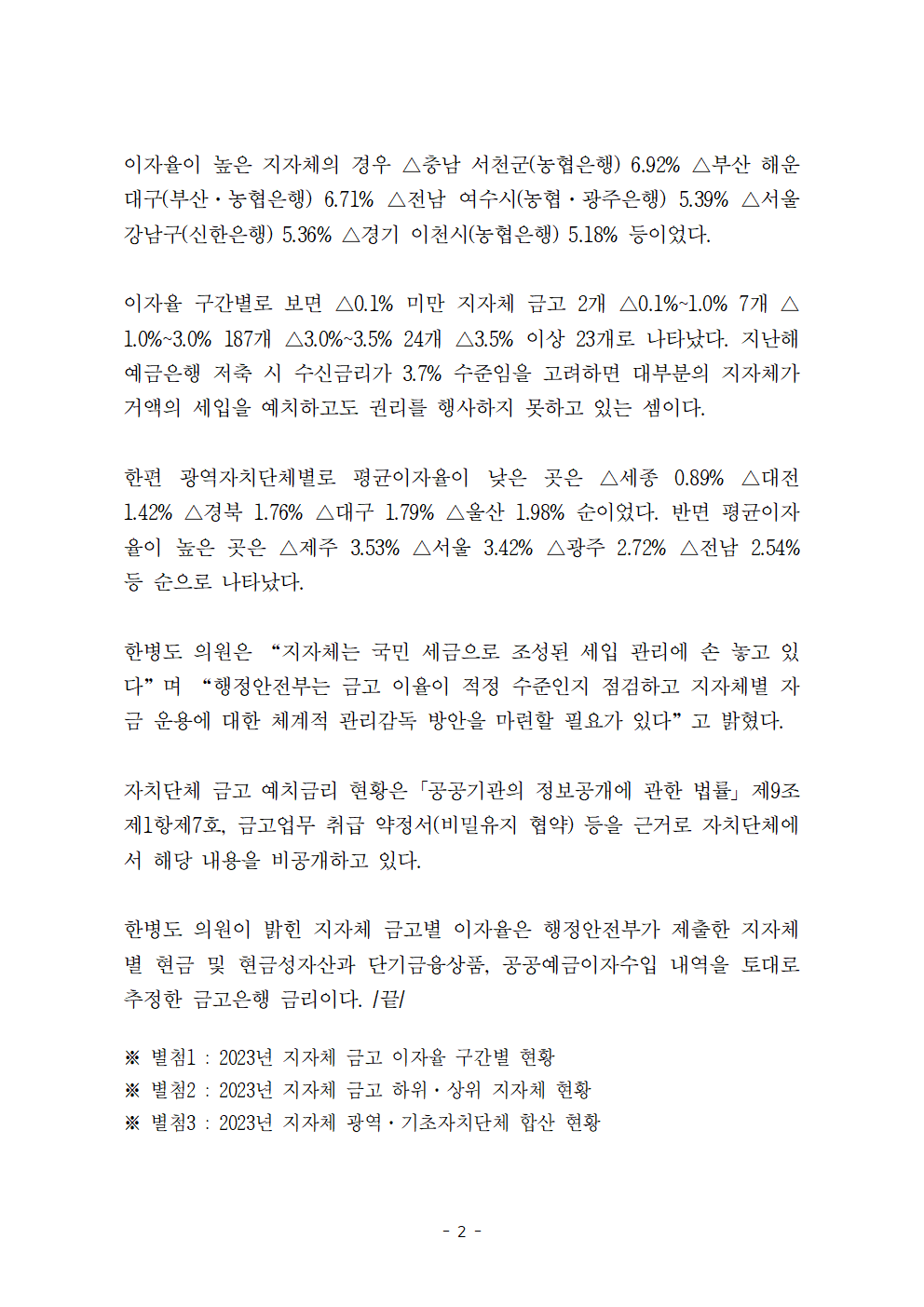 [한병도의원]2024행안위국정감사보도자료(22)_108조 품고 잠자는 지자체 금고 이율 고작 2퍼센트 기준금리에 한참 못미쳐… 0.1퍼센트 미만 은행도.hwp