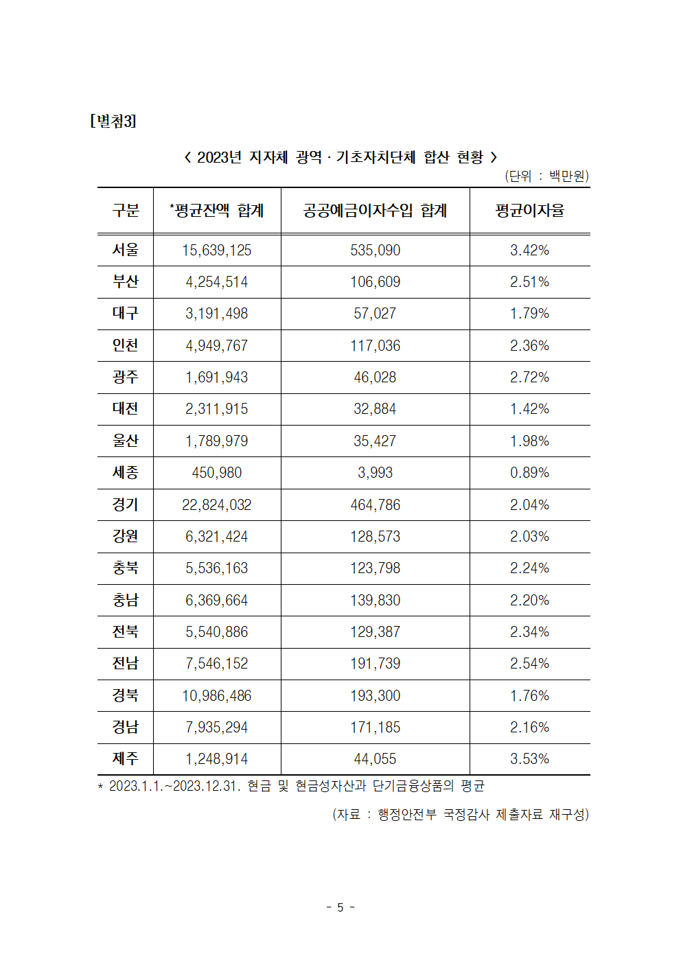[국회의원 한병도 국정감사] 108조 품고 잠자는 지자체 금고 이율 고작 2퍼센트, 기준금리에 한참 못미쳐… 0.1퍼센트 미만 은행도