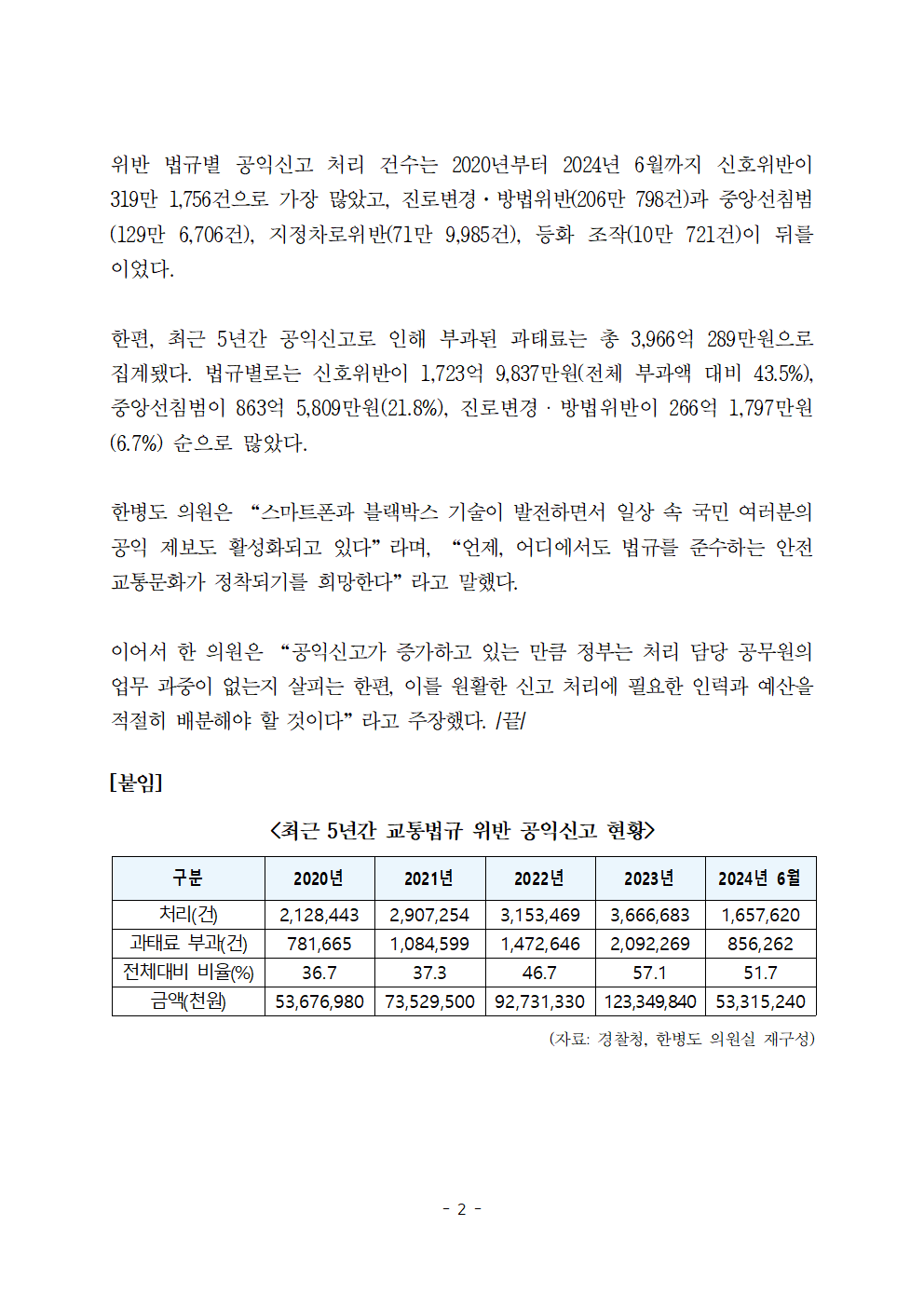 [국회의원 한병도 국정감사] 최근 5년간 교통법규 위반 공익신고 1,351만건... 부과된 과태료만 4천억원 육박