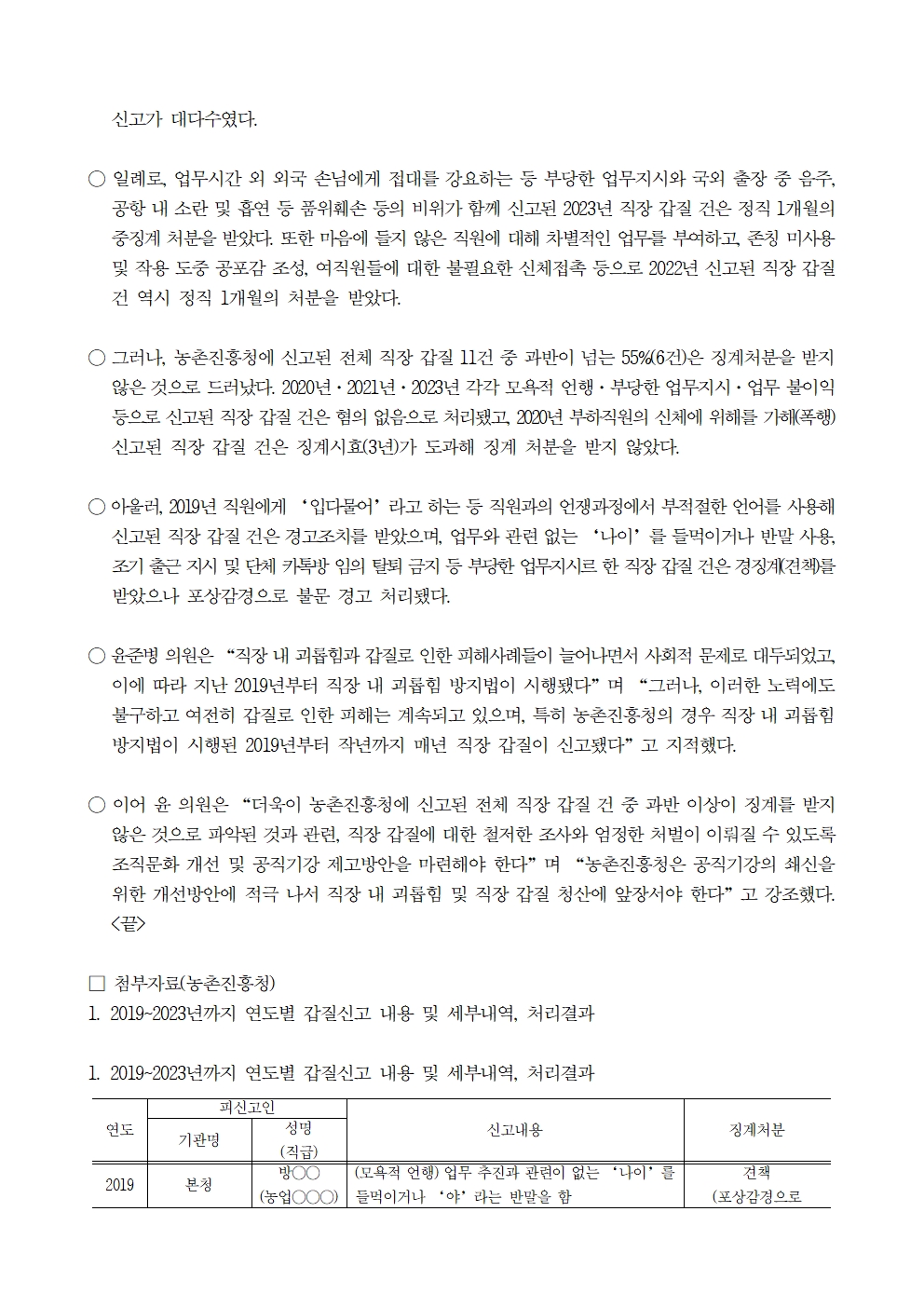 241011 [윤준병 의원 국정감사 보도자료] 5년간 농촌진흥청 매년 갑(甲)질 신고에도_ 55% 징계 안받아!.hwp