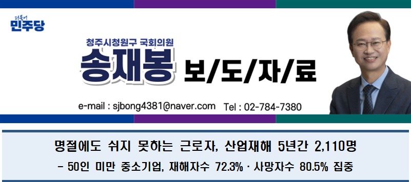 더불어민주당 송재봉 국회의원(산업통상자원중소벤처기업위원회, 충북 청주청원)이 고용노동부로부터 받은 자료에 따르면, 최근 5년간(2019년~2023년) 설과 추석 명절 연휴 기간에 발생한 산업재해로 죽거나 다친 사람이 모두 2110명에 달하는 것으로 집계됐다.