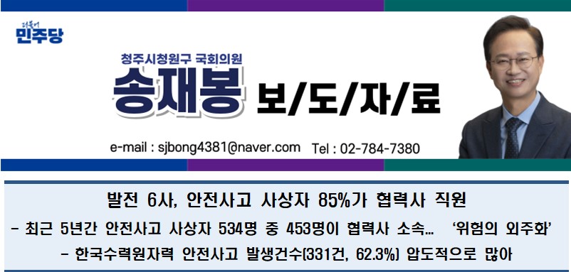 [국회의원 송재봉]발전 6사, 안전사고 사상자 85%가 협력사 직원