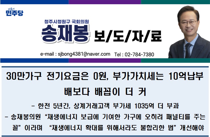[국회의원 송재봉]30만가구 전기요금은 0원, 부가가치세는 10억납부 배보다 배꼽이 더 커