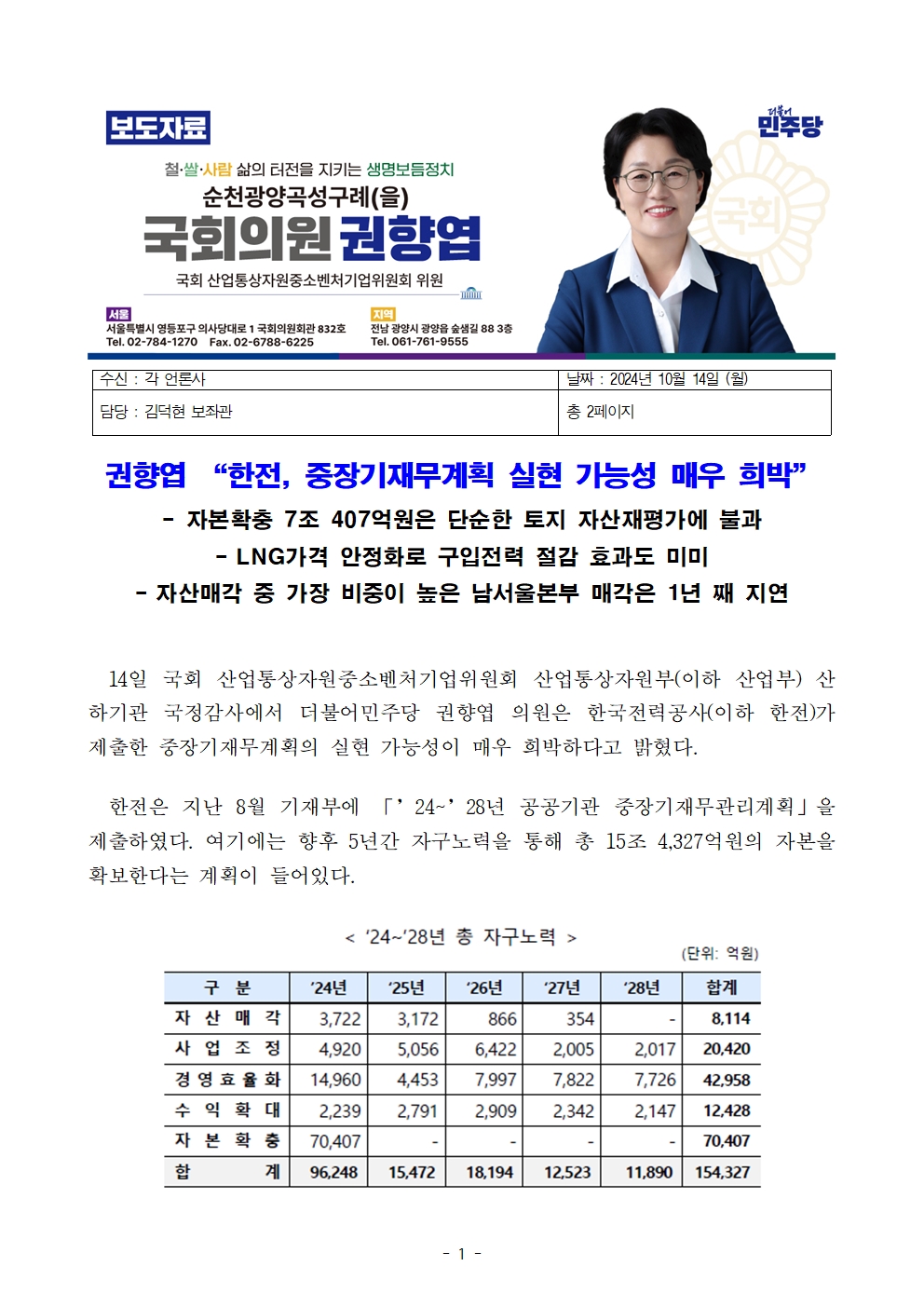 [권향엽 국회의원] 241014 보도자료_한전 중장기재무계획 실현 가능성 매우 희박.hwp