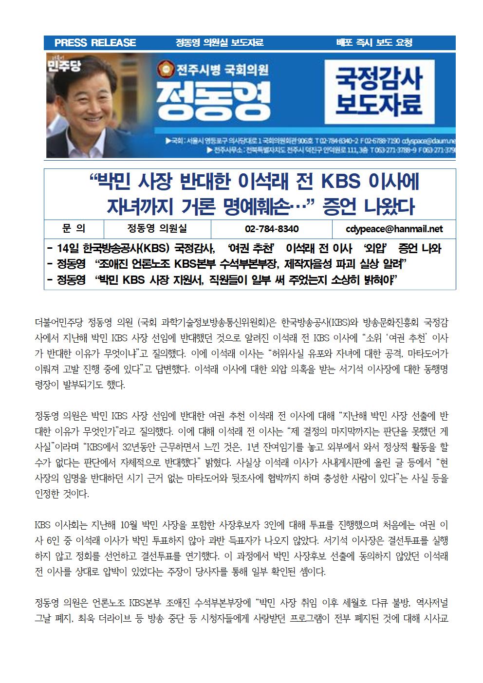 [국회의원 정동영 국감보도자료] “박민 사장 반대한 이석래 전 KBS 이사에자녀까지 거론 명예훼손…”증언 나왔다