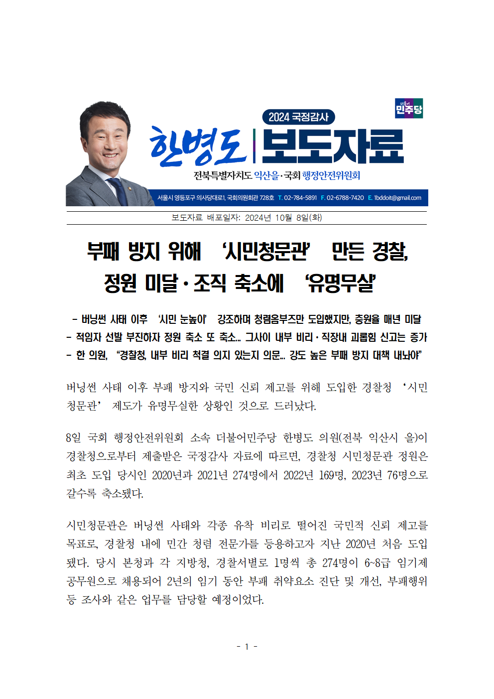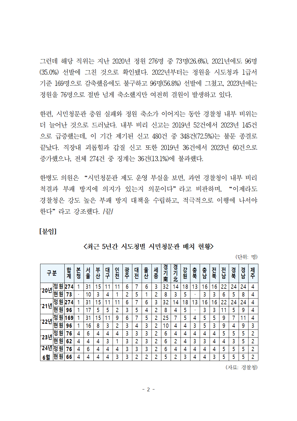 [한병도의원]2024행안위국정감사보도자료(30)부패 방지 위해 ‘시민청문관’ 만든 경찰 정원 미달-조직 축소에 ‘유명무실’.hwp