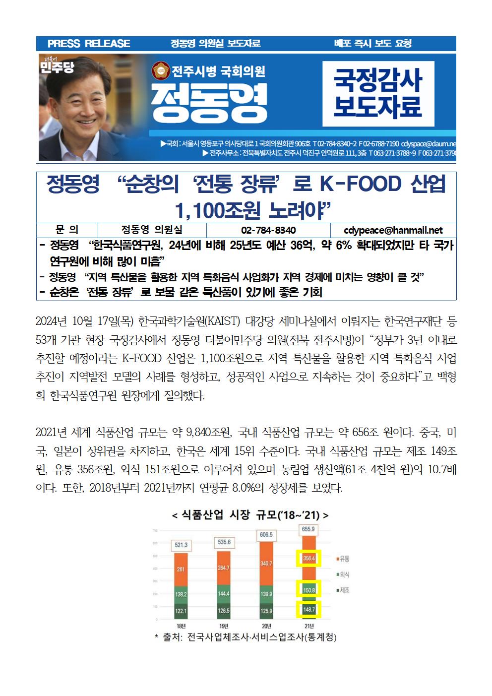 [국회의원 정동영 국감보도자료] 정동영 “순창의‘전통 장류’로 K-FOOD 산업 1,100조원 노려야”