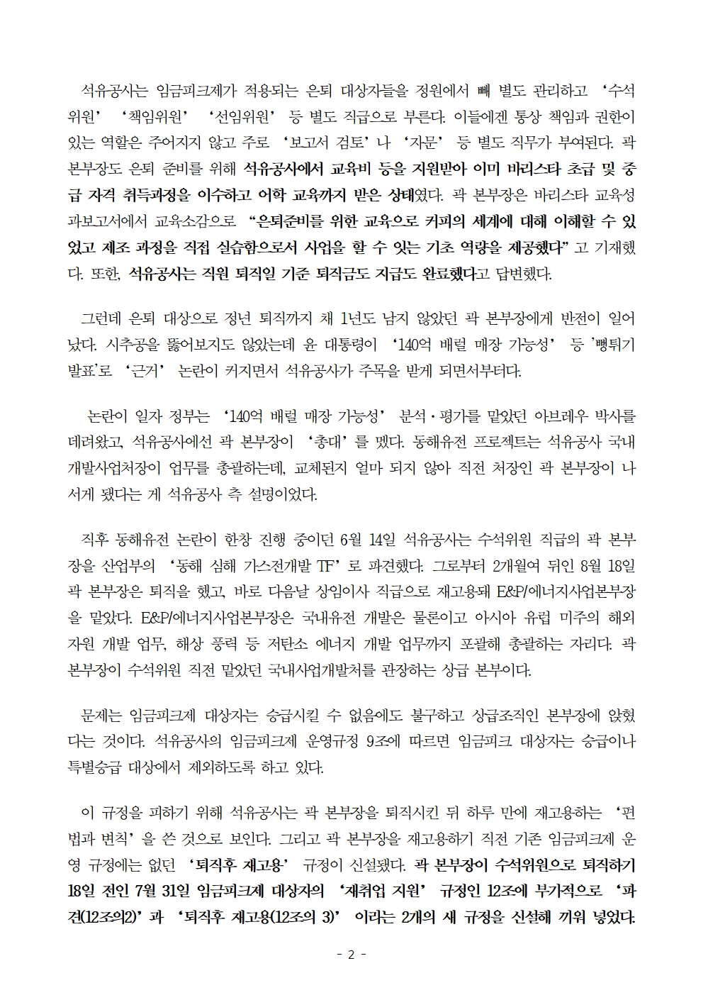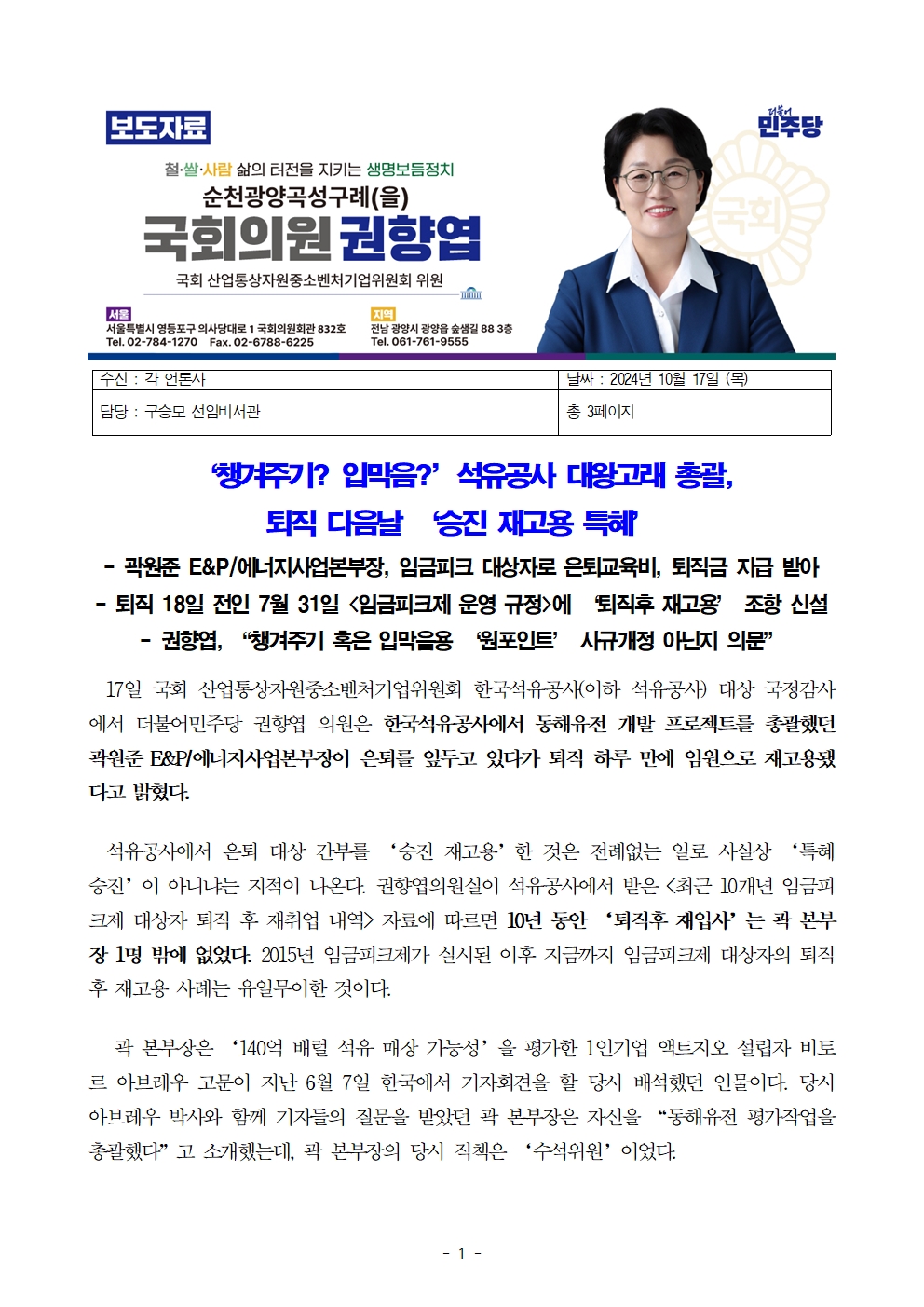 [권향엽 국회의원] 241017 보도자료_‘챙겨주기냐 입막음이냐’ 석유공사 대왕고래 총괄 퇴직 다음날 승진 재고용 특혜.hwp