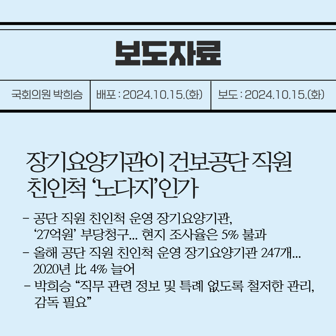 [국회의원 박희승 보도자료] 장기요양기관이 건보공단 직원 친인척 ‘노다지’인가