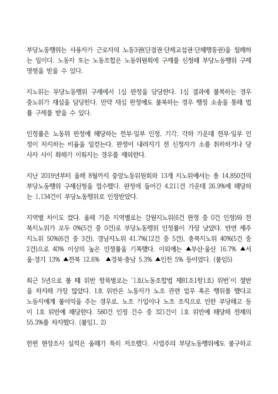 지역별 차이도 컸다. 올해 기준 지역별로는 강원지노위(6건 판정 중 0건 인정)와 전북지노위가 모두 0%(5건 중 0건)로 부당노동행위 인정률이 가장 낮았다. 반면 제주지노위 50%(6건 중 3건), 경남지노위 41.7%(12건 중 5건), 충북지노위 40%(5건 중 2건)으로 40% 이상의 높은 인정률을 기록했다. 이외에는 ▲부산·울산 16.7% ▲서울·경기 13% ▲전북 12.6% ▲경북·충남 5.3% ▲인천 5% 등이었다. (붙임5)