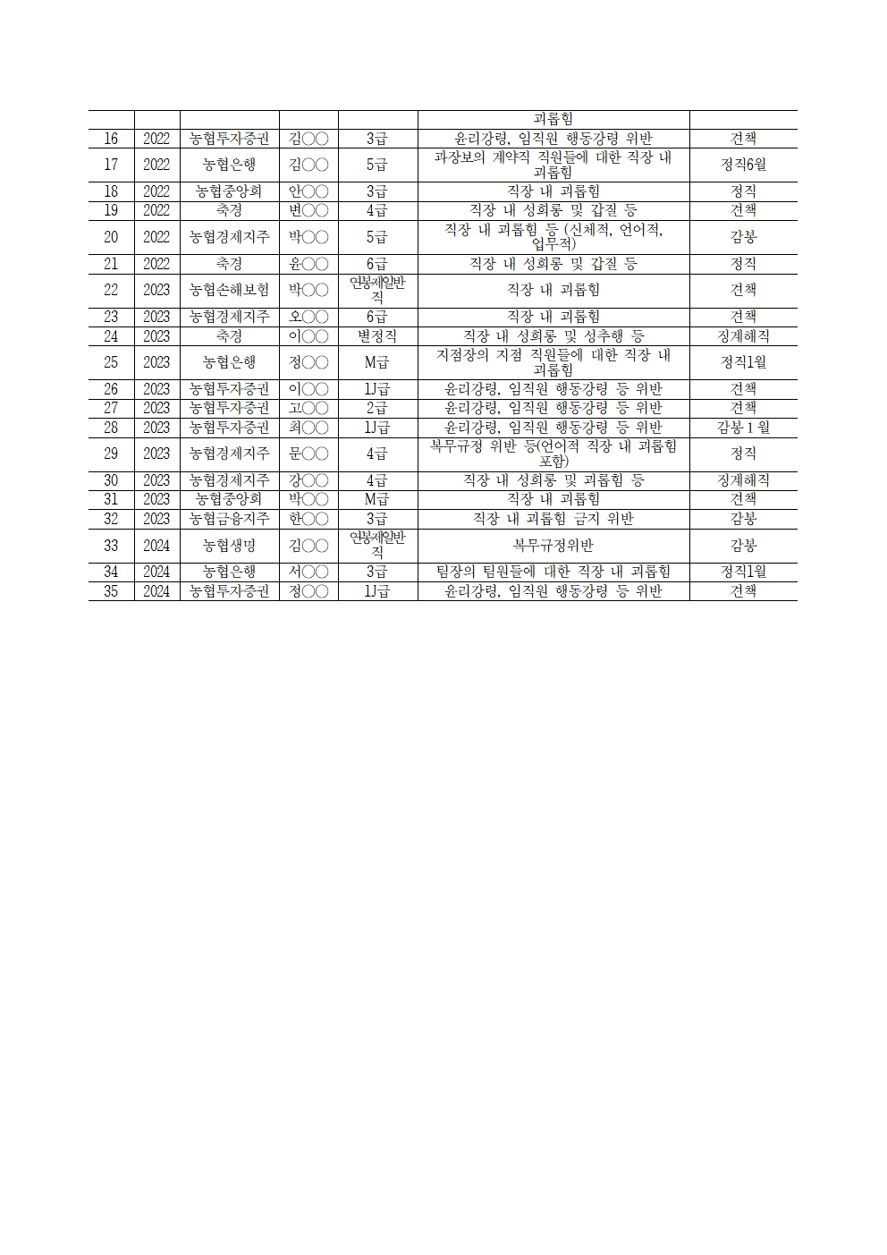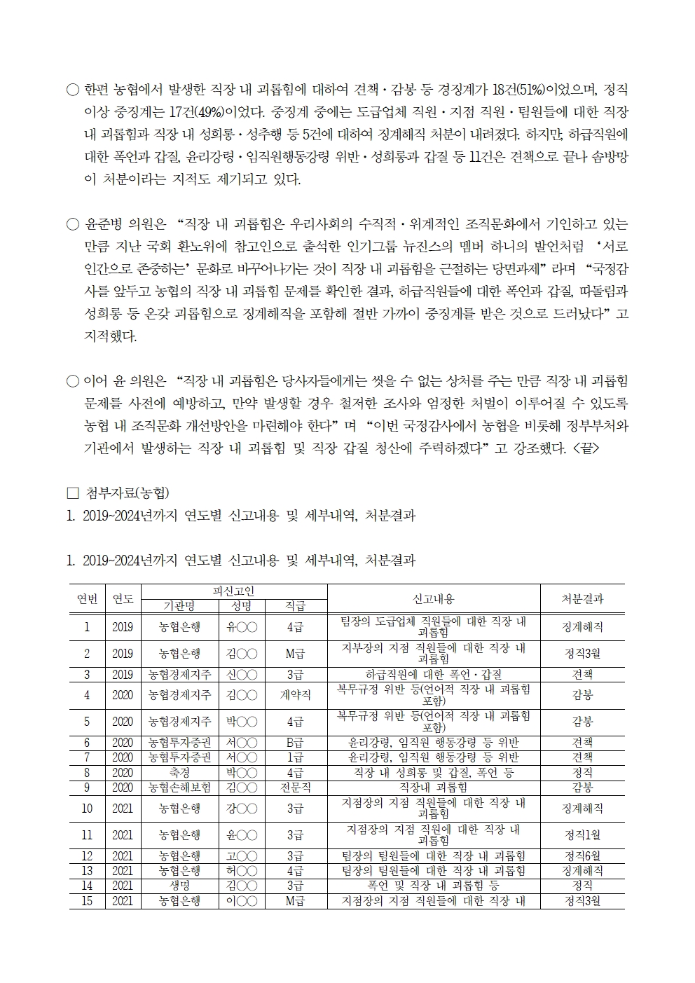 [윤준병 의원 국정감사 보도자료] 5년간 농협에서 발생한 직장 내 괴롭힘에 절반이 중징계_ 징계해직만 5건
