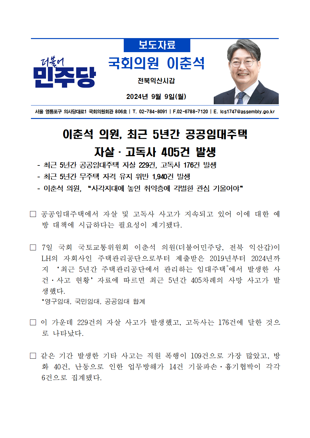 240909_이춘석 의원_ 최근 5년간 공공임대주택 자살·고독사 405건 발생.hwp