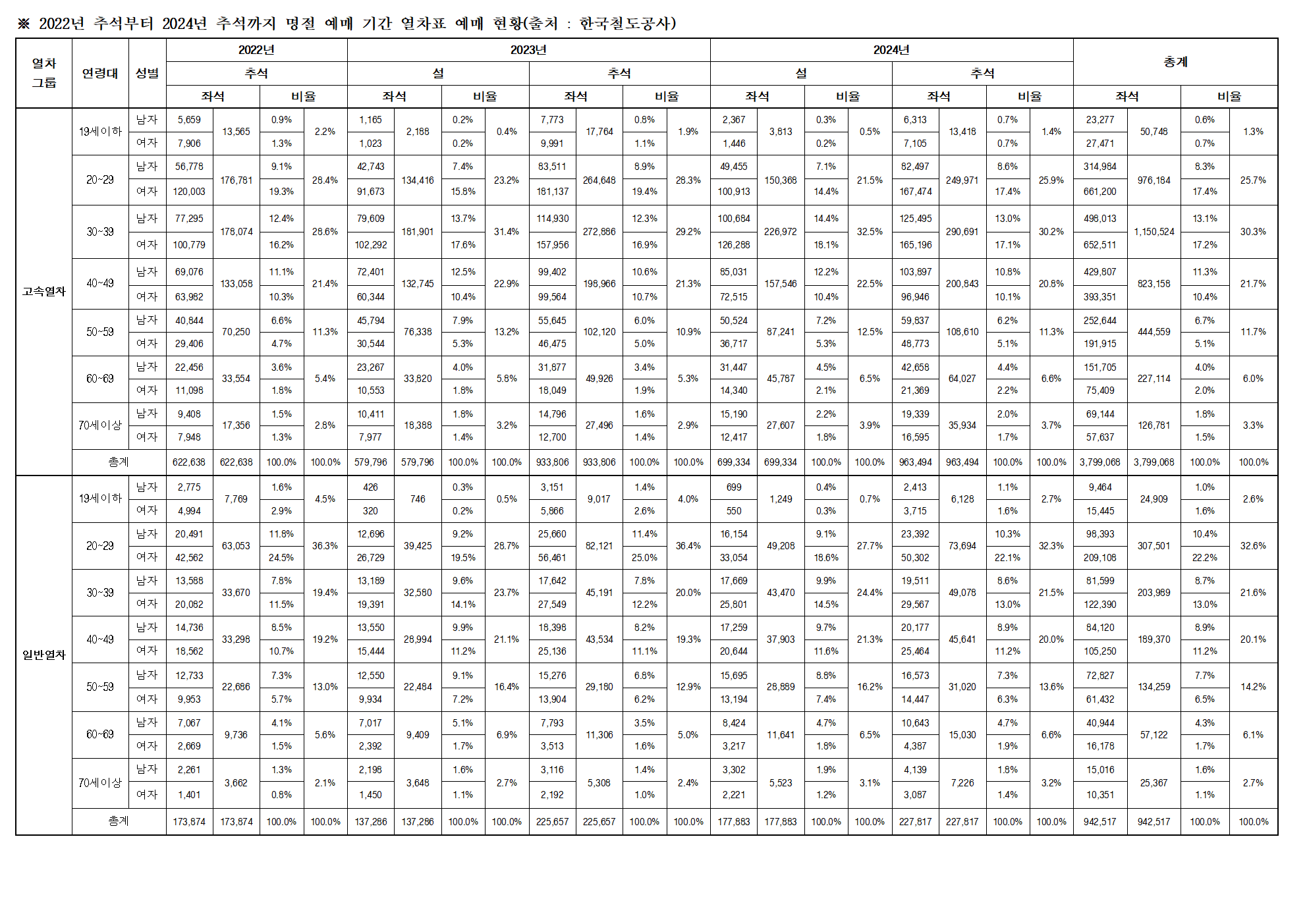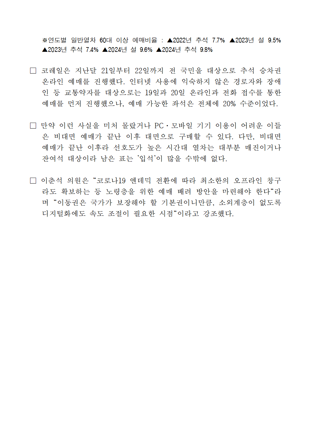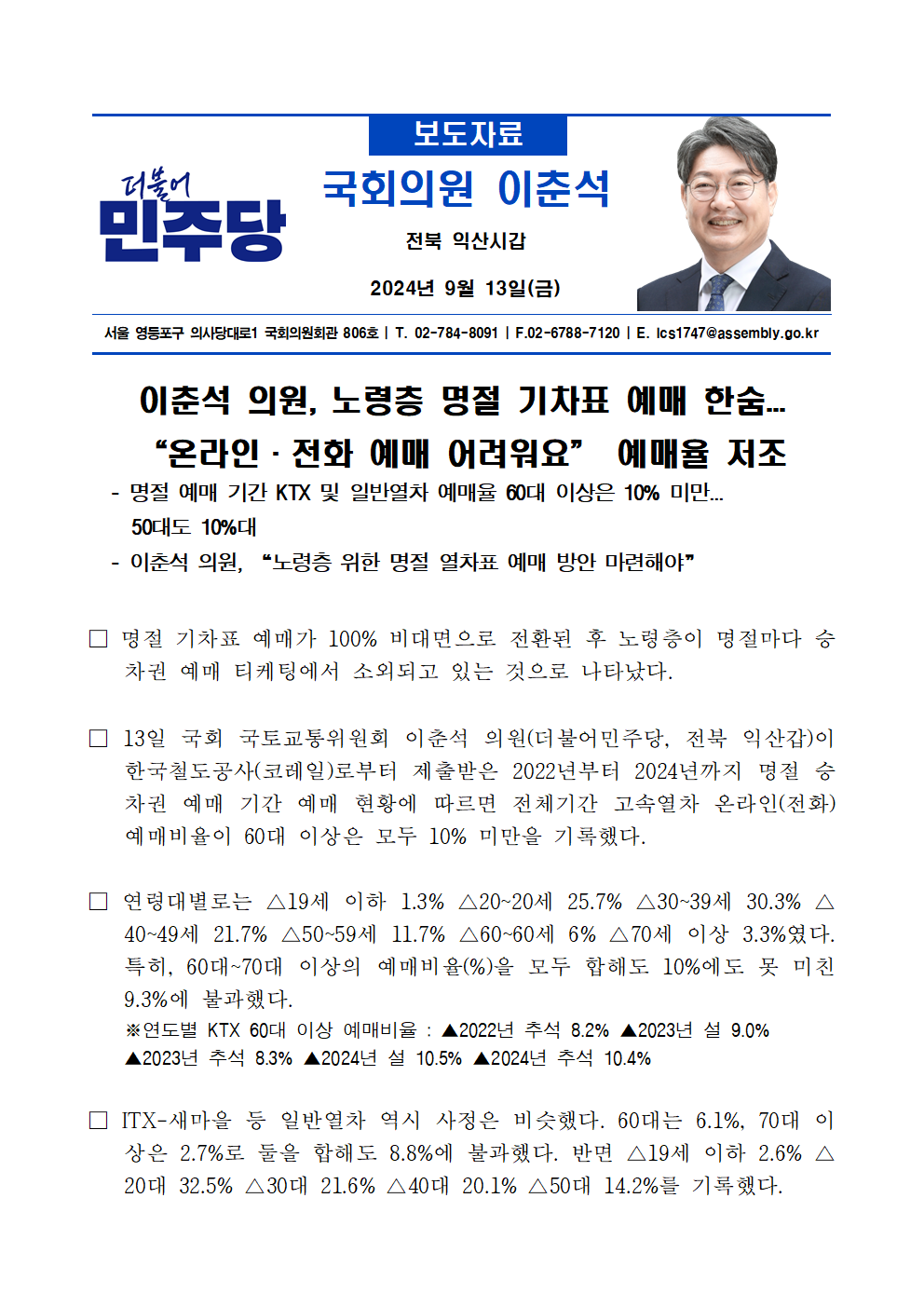 [이춘석 의원 국정감사 보도자료] 이춘석 의원, 노령층 명절 기차표 예매 한숨...“온라인·전화 예매 어려워요” 예매율 저조