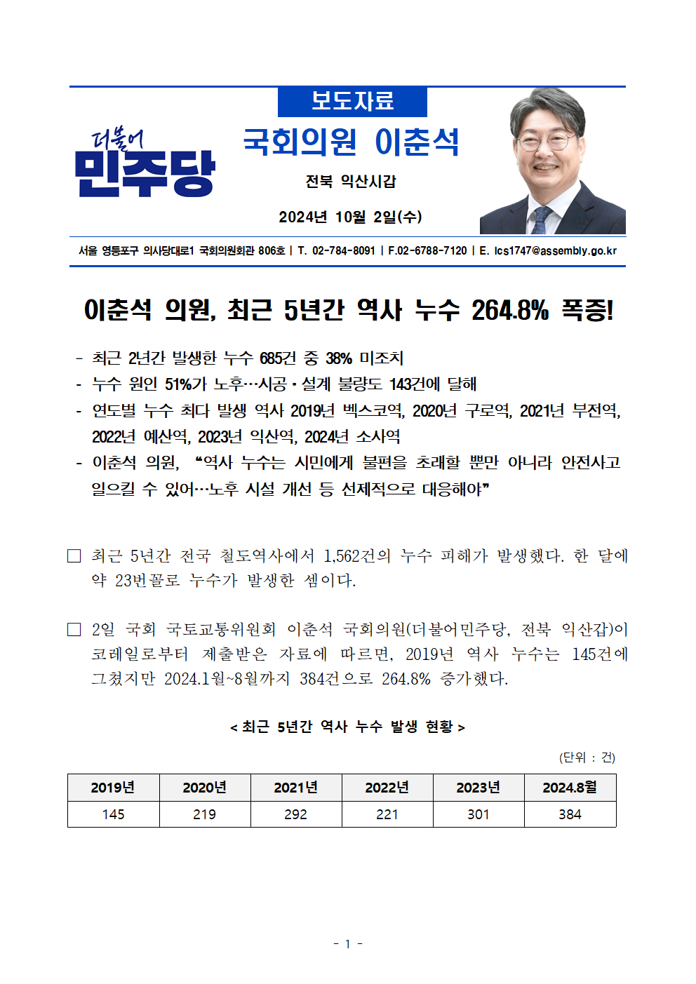 국정감사_보도자료_241002_이춘석_의원__최근_5년_새_역사_누수_264_8%_폭증!.hwp