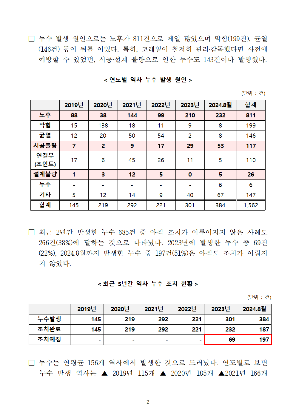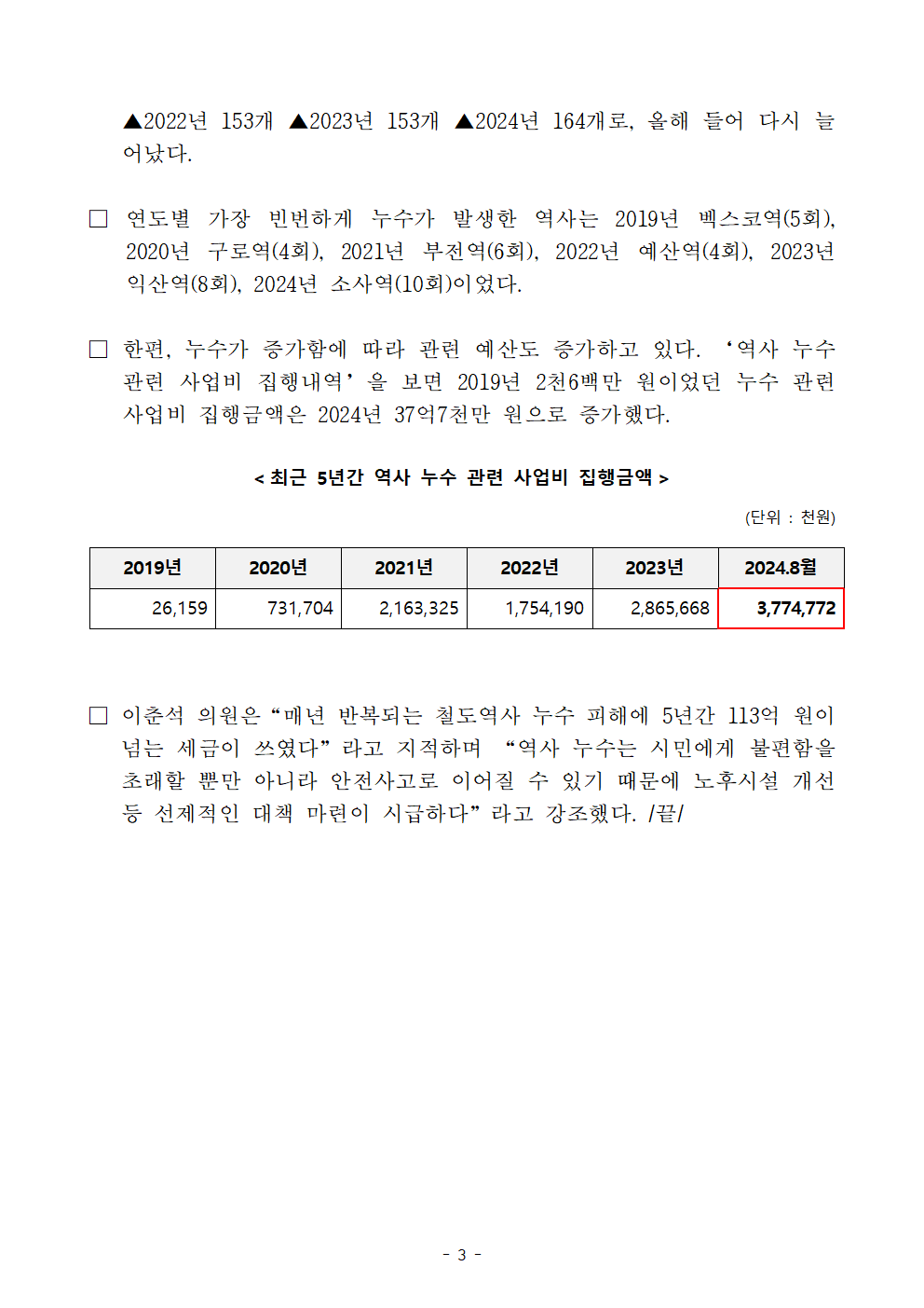 [이춘석 의원 국정감사 보도자료] 이춘석 의원, 최근 5년간 역사 누수 264.8% 폭증!