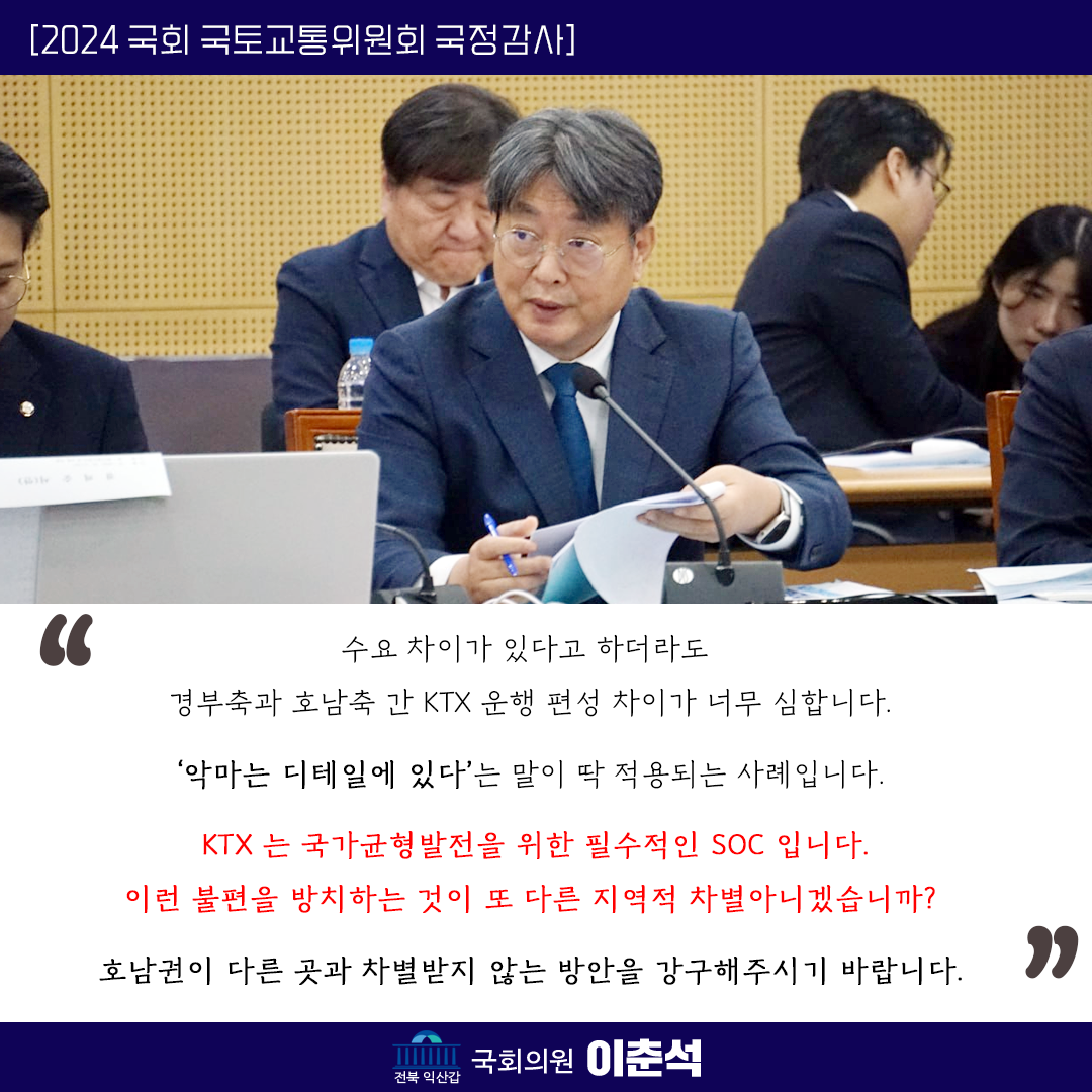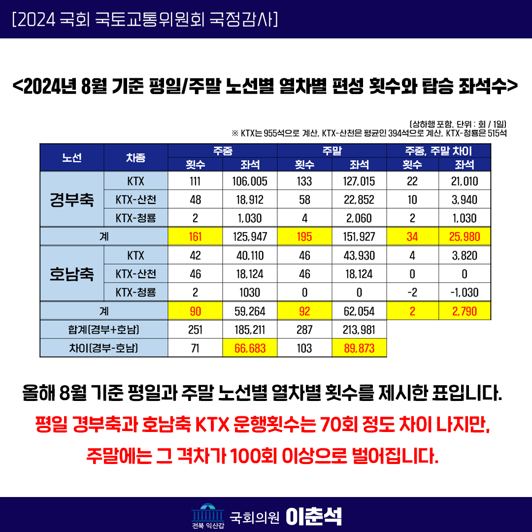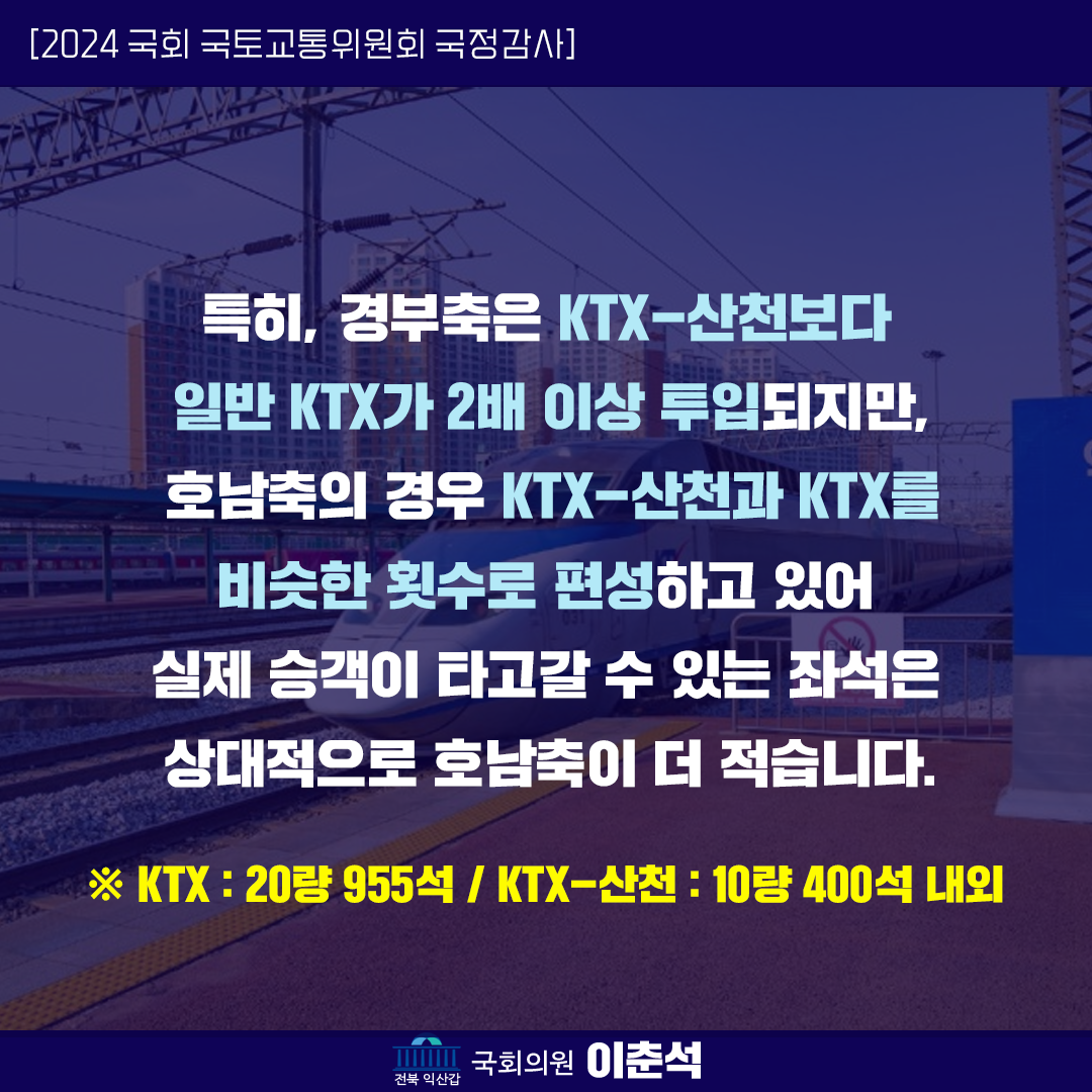 [이춘석 의원 국정감사 카드뉴스] KTX 운행 편수 경부축-호남축 차이 커, 열차 운행마저 지역 차별