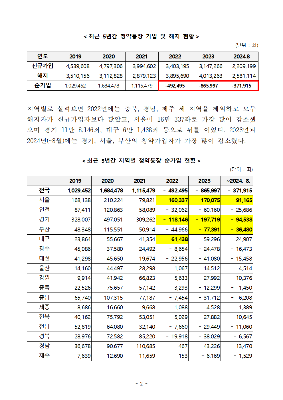 [이춘석 의원 국정감사 보도자료] 이춘석 의원, 지난해 청약통장 86만 5,997좌 감소