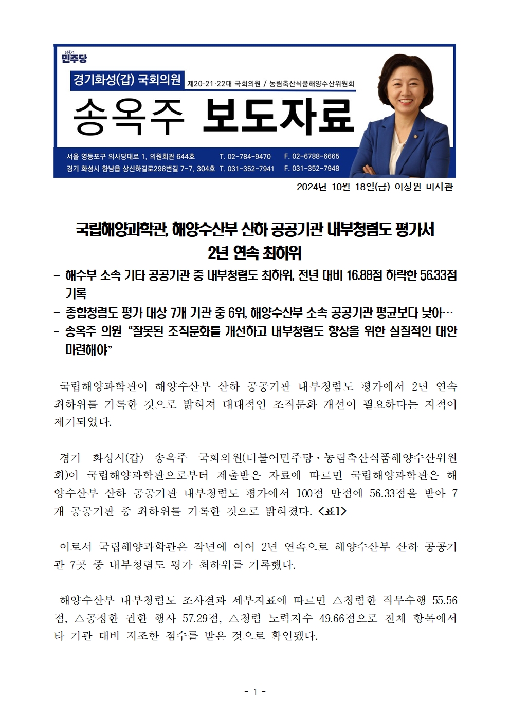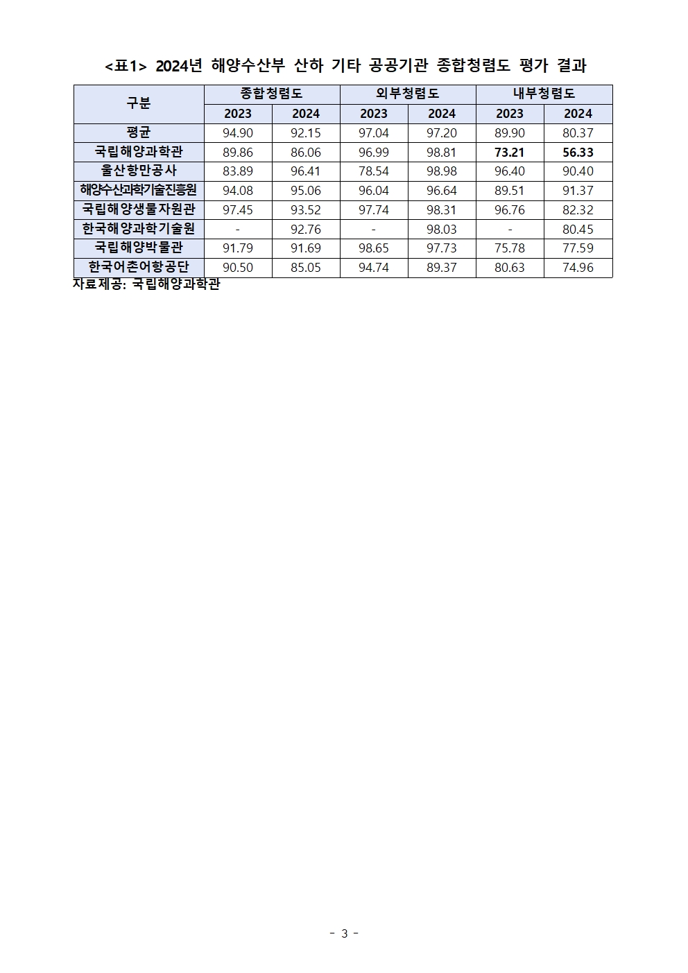 보도자료_송옥주의원실_국립해양과학관 해양수산부 산하 공공기관 내부청렴도 평가서 2년 연속 최하위.hwp